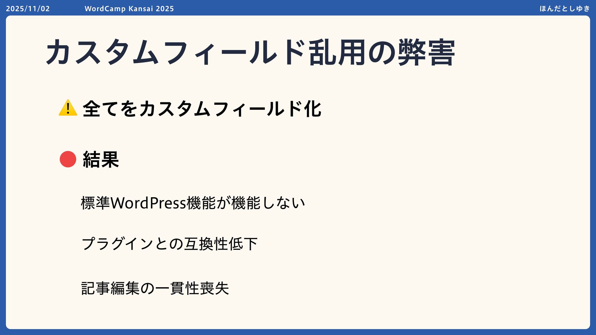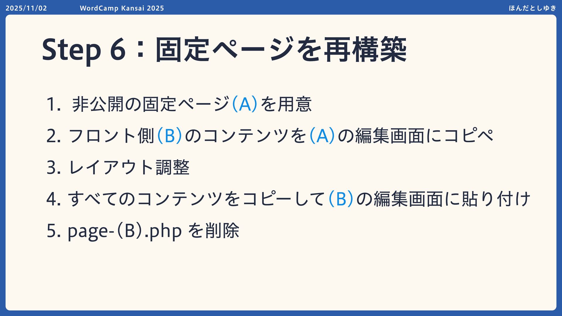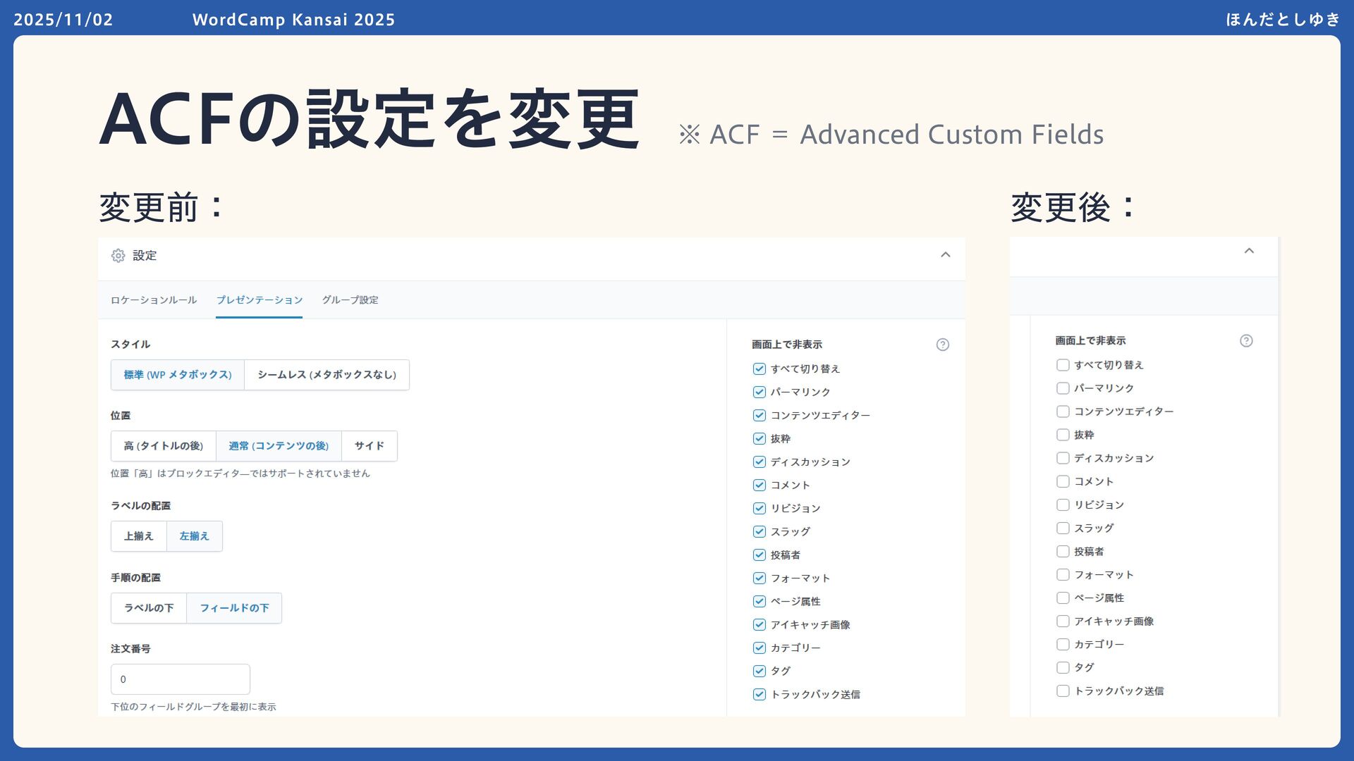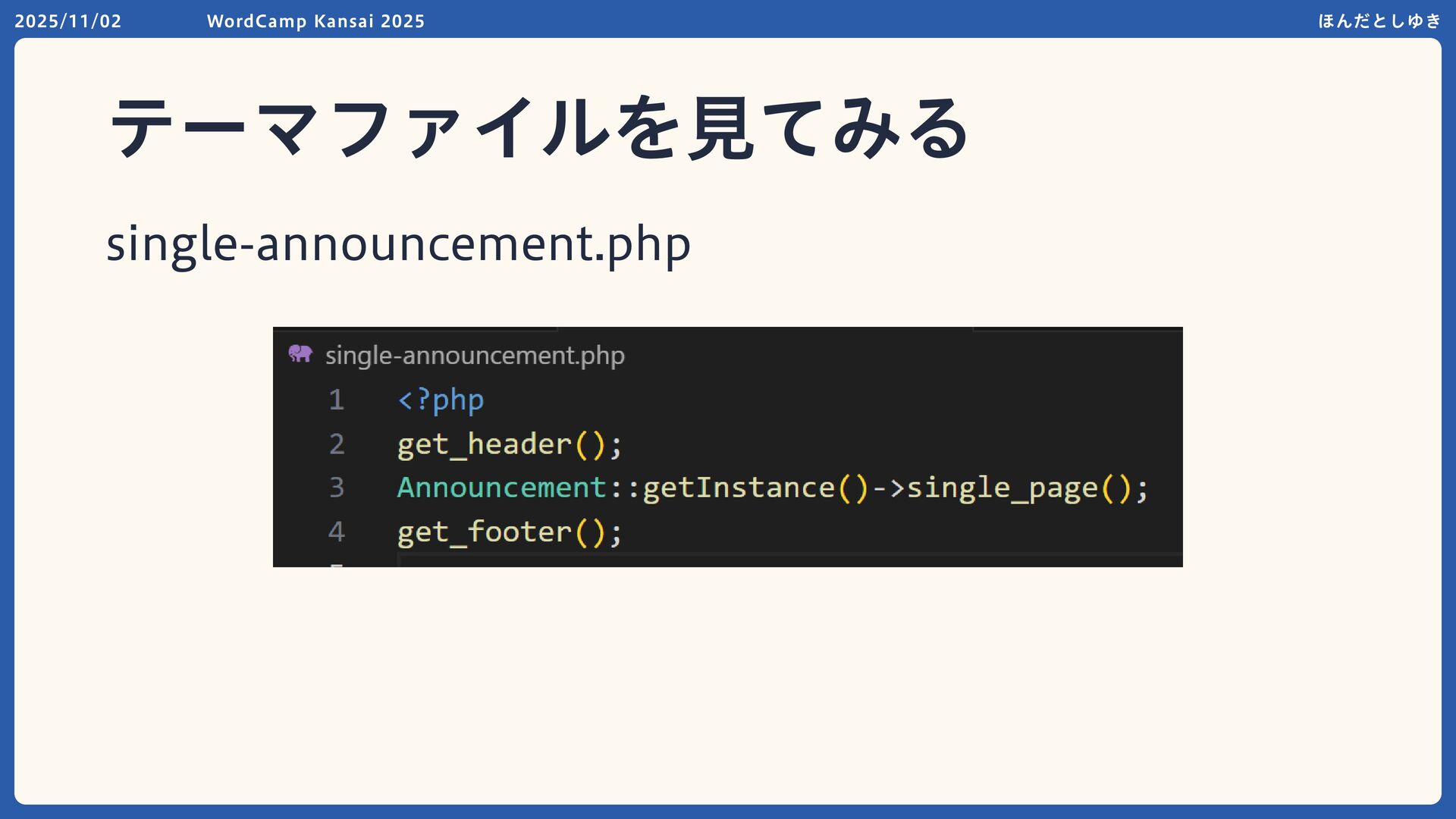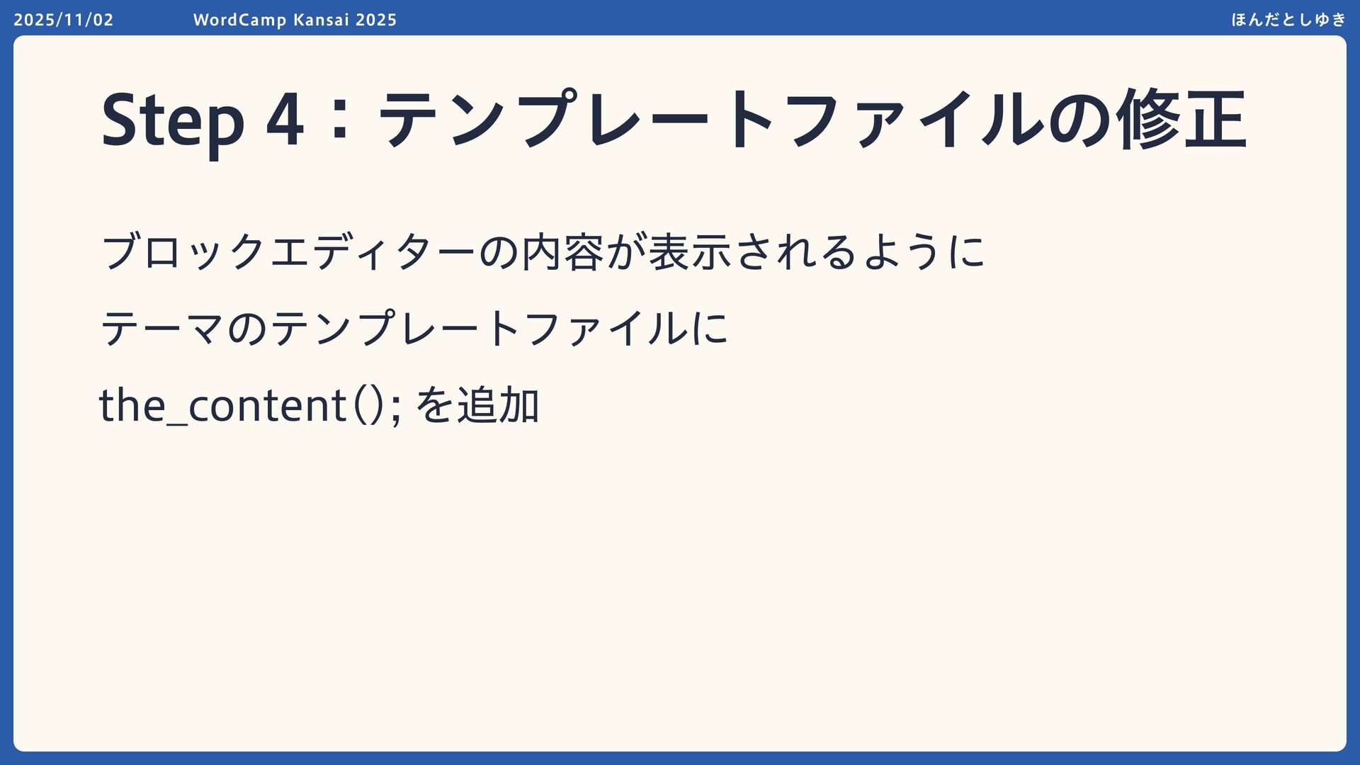 page-{slug}.phpにハードコーディングされた内容や、ページタイトル、アイキャッチ、カテゴリー、コンテンツ部分が全部ACFで定義されたカスタムフィールドになっているなど、現場で遭遇したレガシーな実装をAIの力も借りながら、ブロックエディター対応にした実際の事例をお話ししました。
