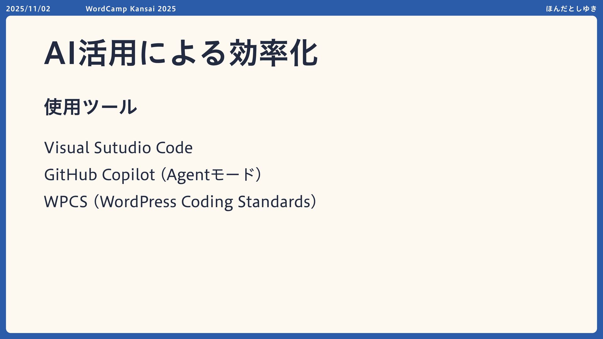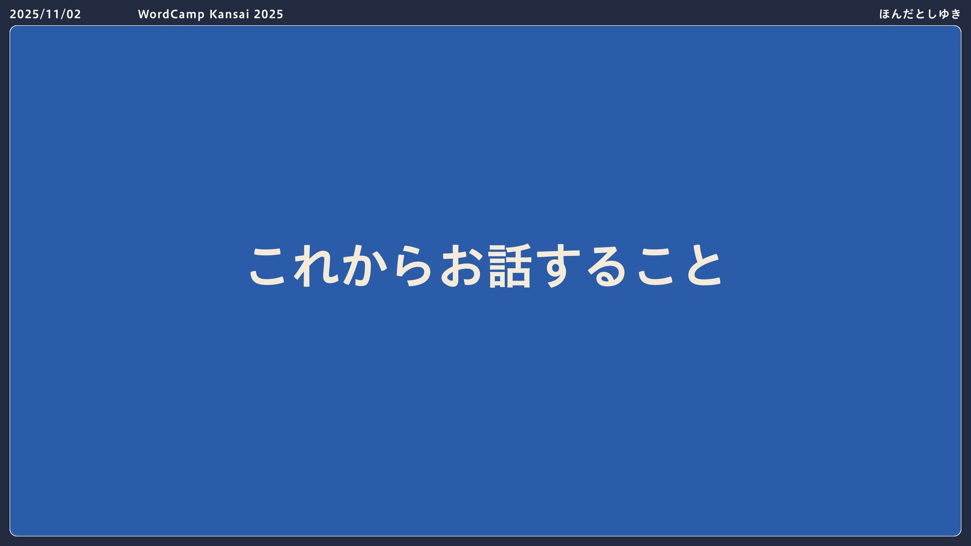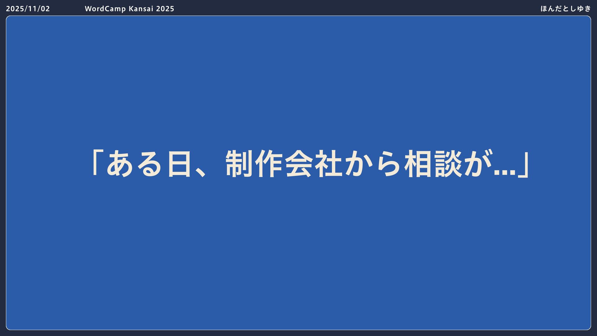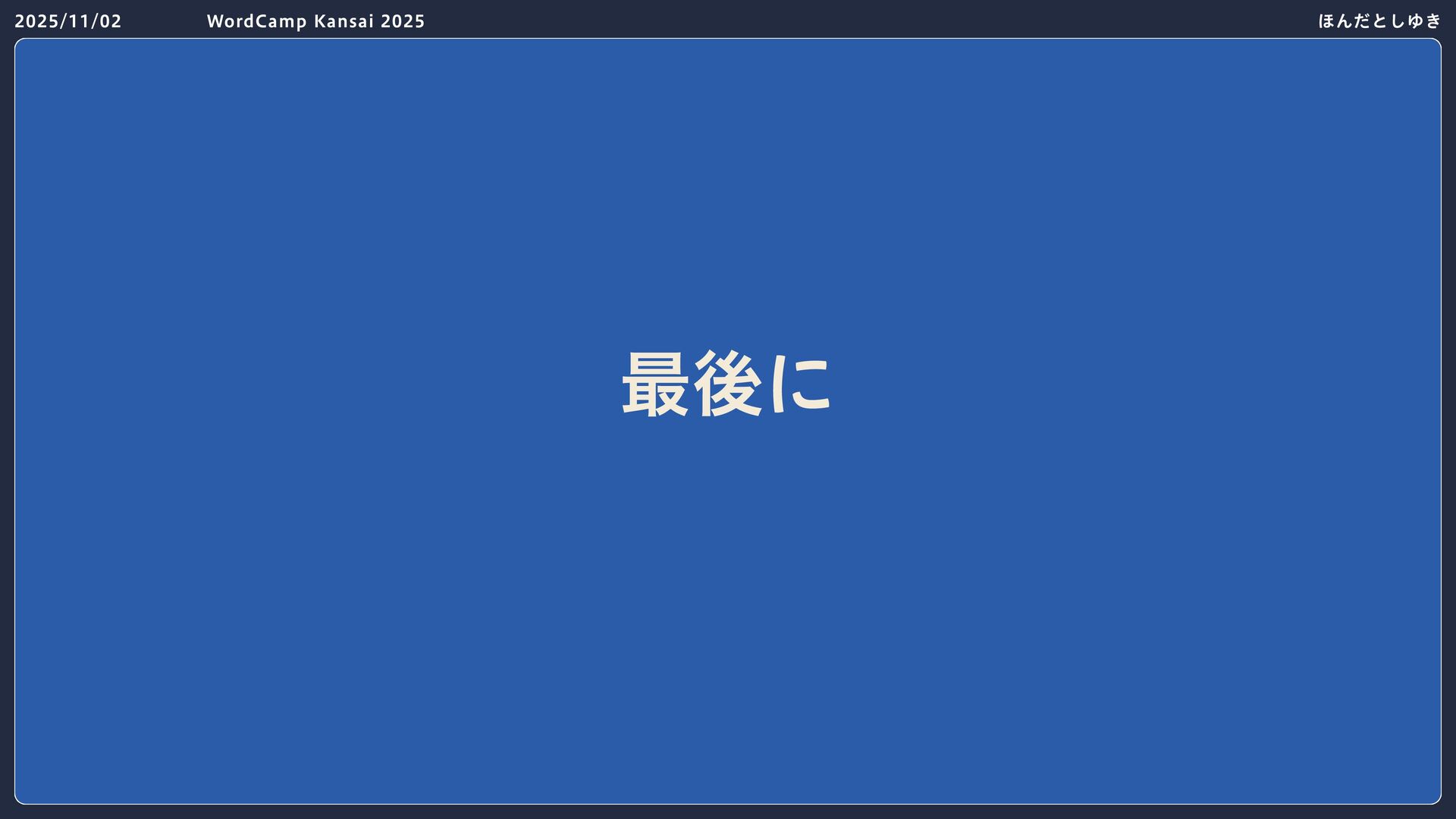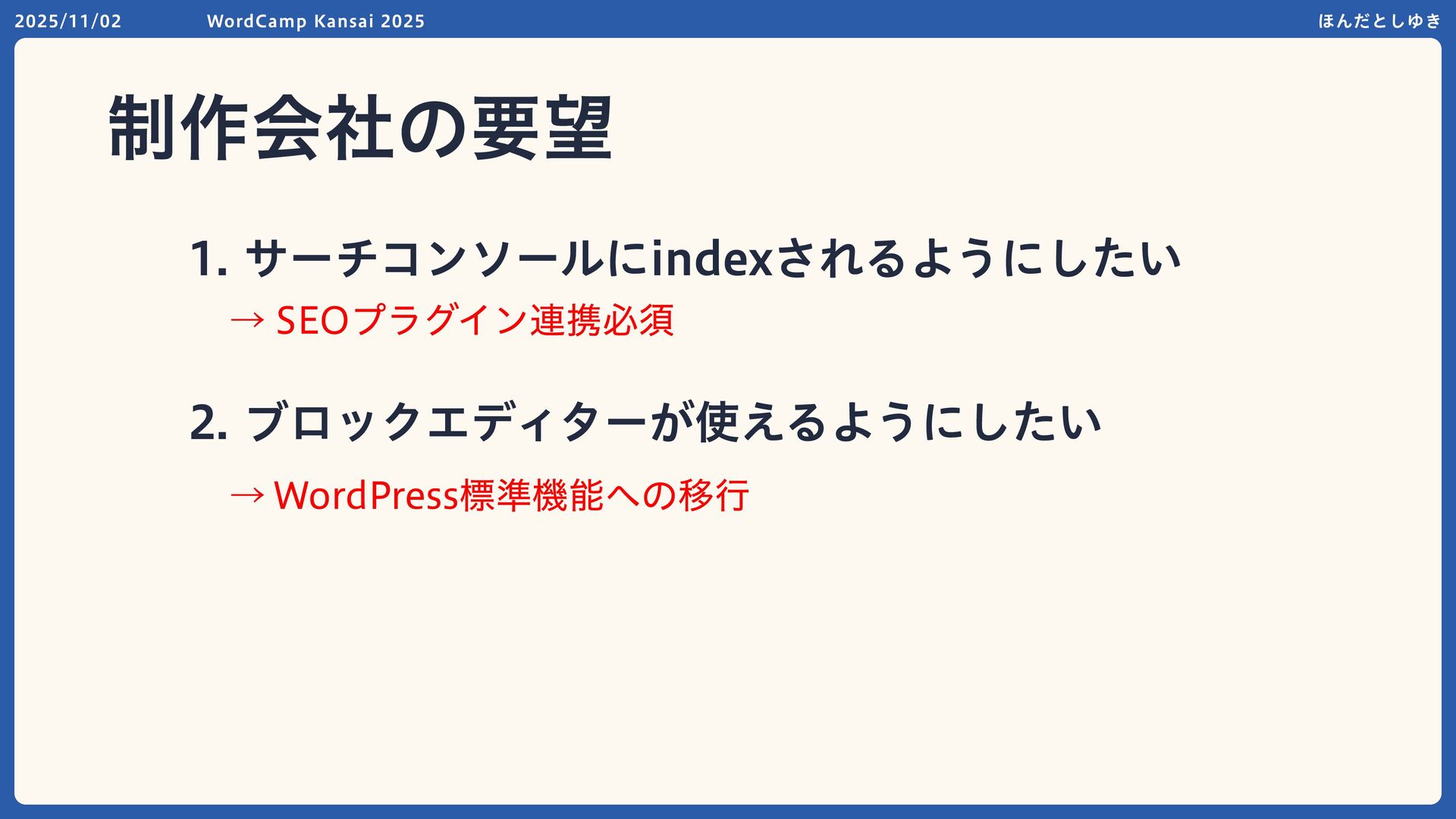 page-{slug}.phpにハードコーディングされた内容や、ページタイトル、アイキャッチ、カテゴリー、コンテンツ部分が全部ACFで定義されたカスタムフィールドになっているなど、現場で遭遇したレガシーな実装をAIの力も借りながら、ブロックエディター対応にした実際の事例をお話ししました。
