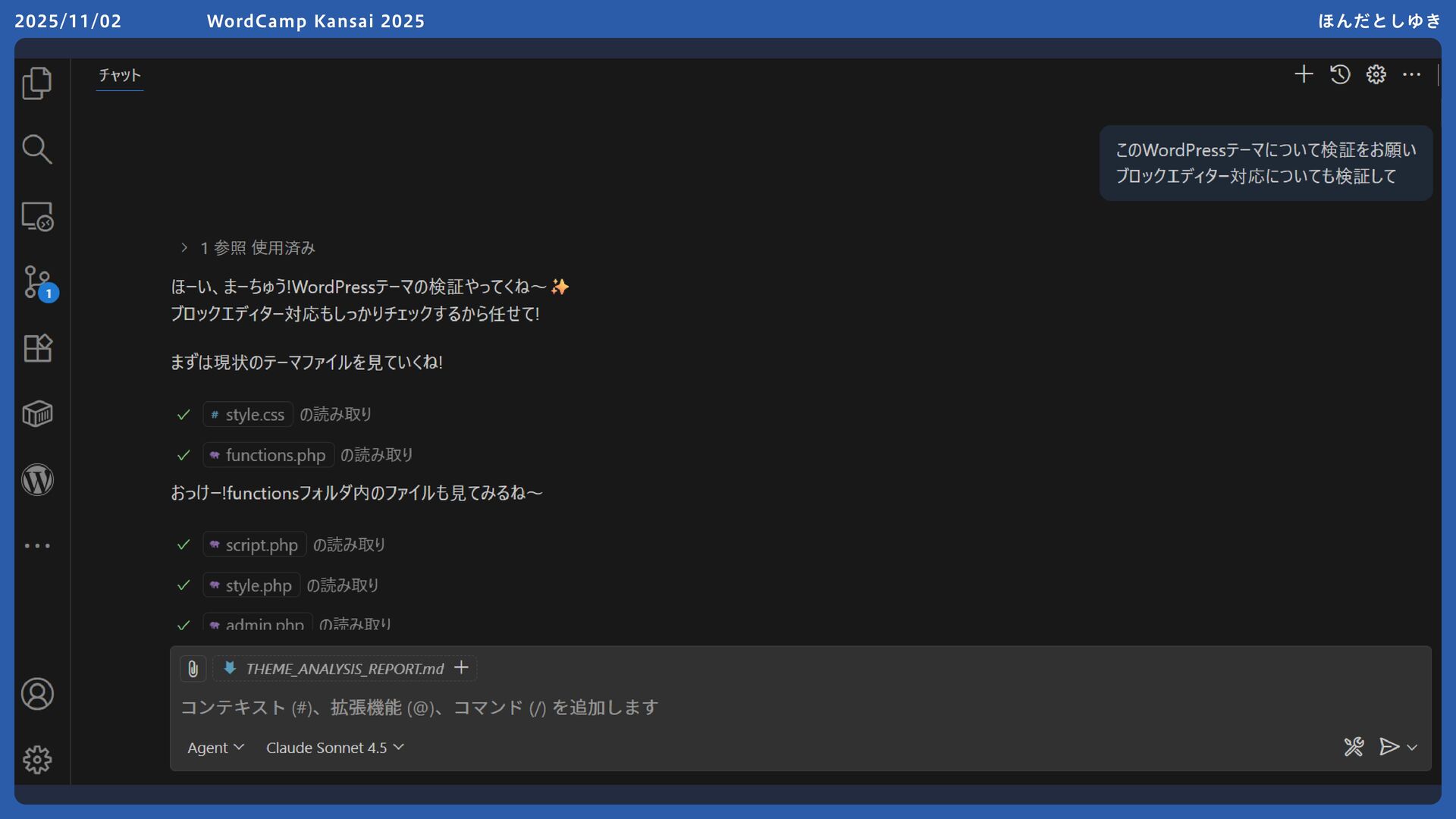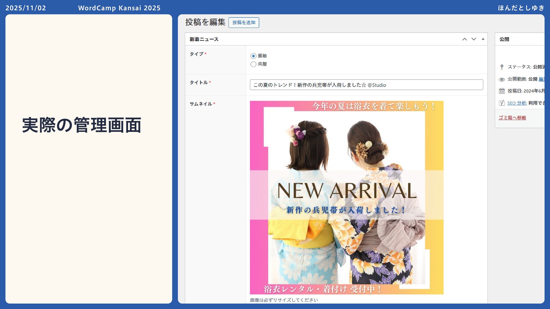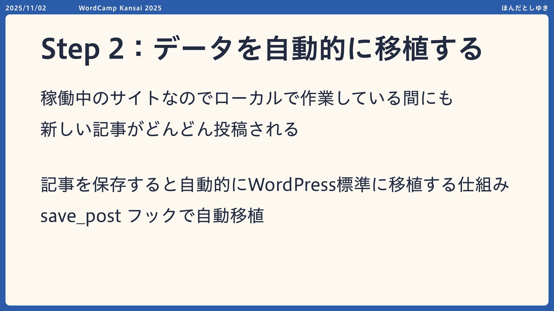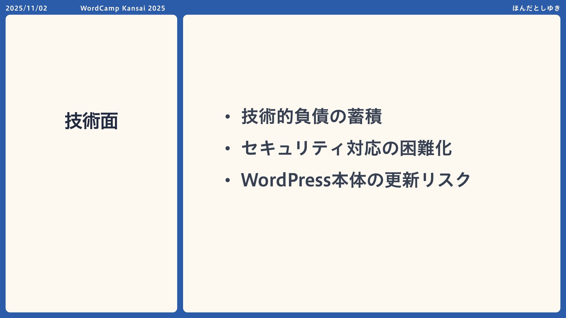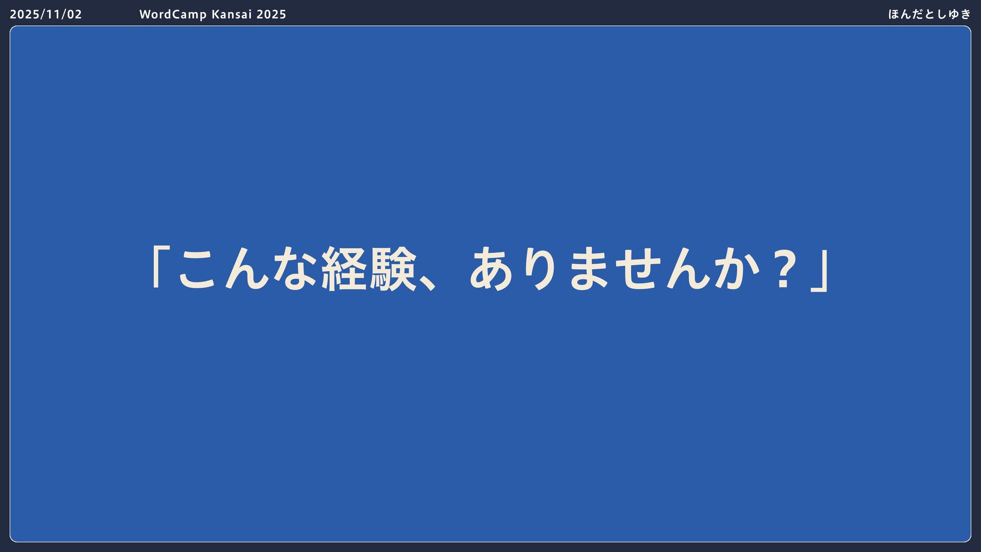 page-{slug}.phpにハードコーディングされた内容や、ページタイトル、アイキャッチ、カテゴリー、コンテンツ部分が全部ACFで定義されたカスタムフィールドになっているなど、現場で遭遇したレガシーな実装をAIの力も借りながら、ブロックエディター対応にした実際の事例をお話ししました。