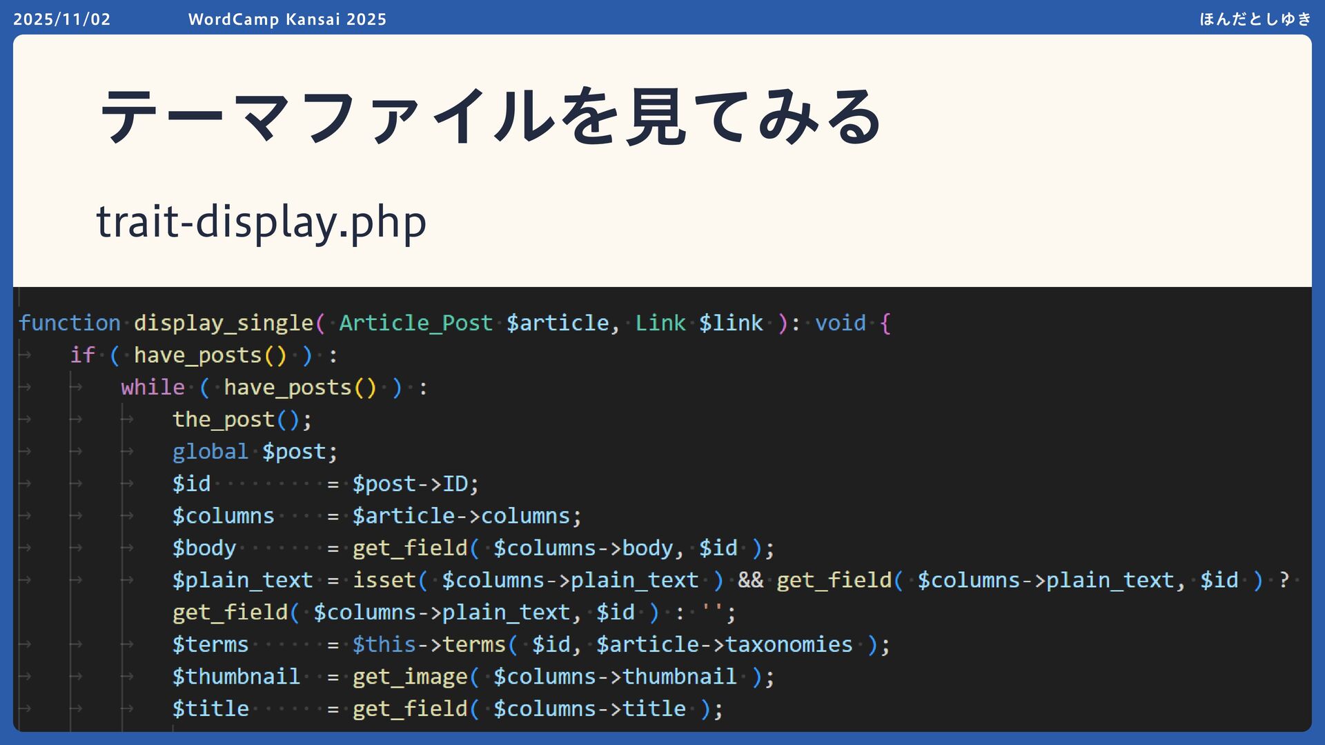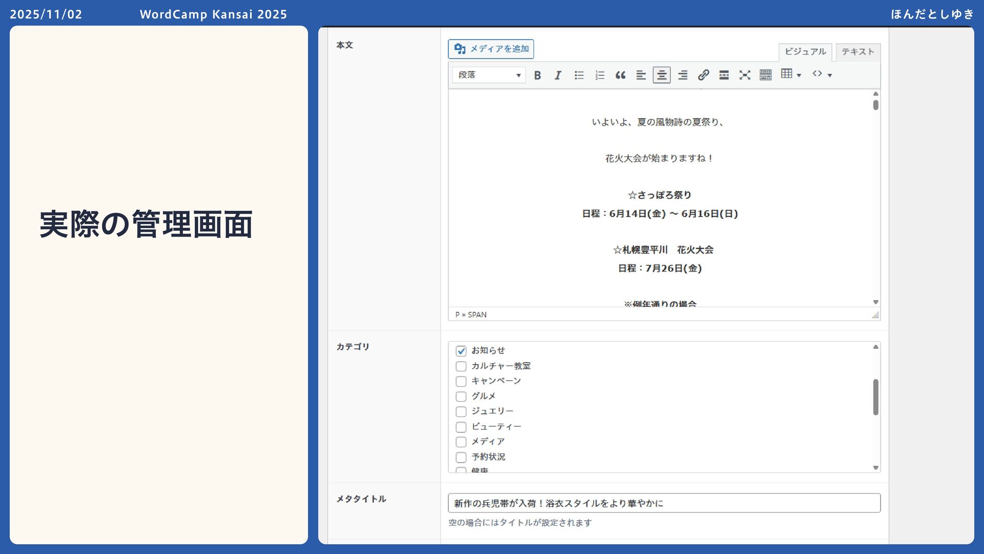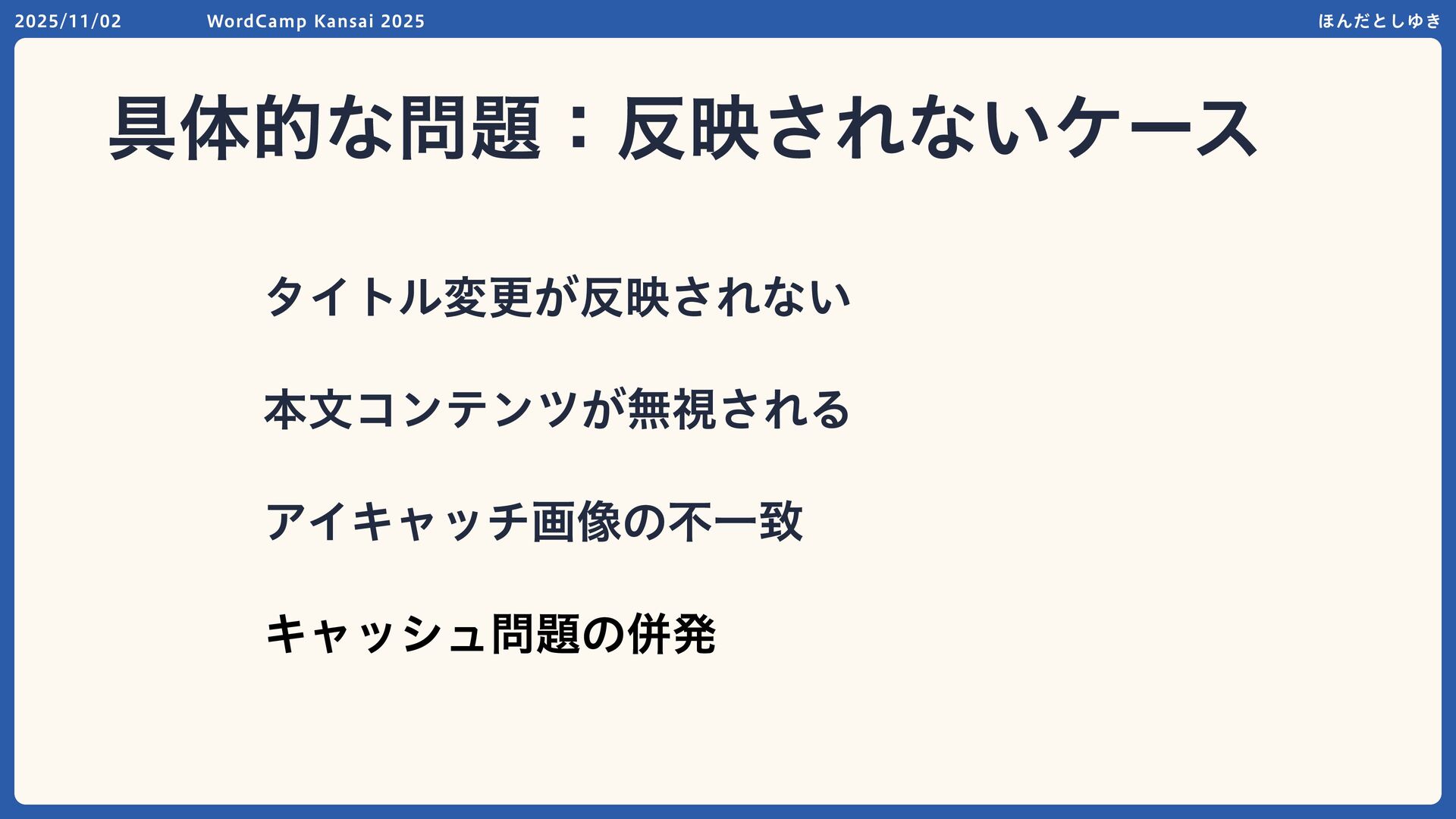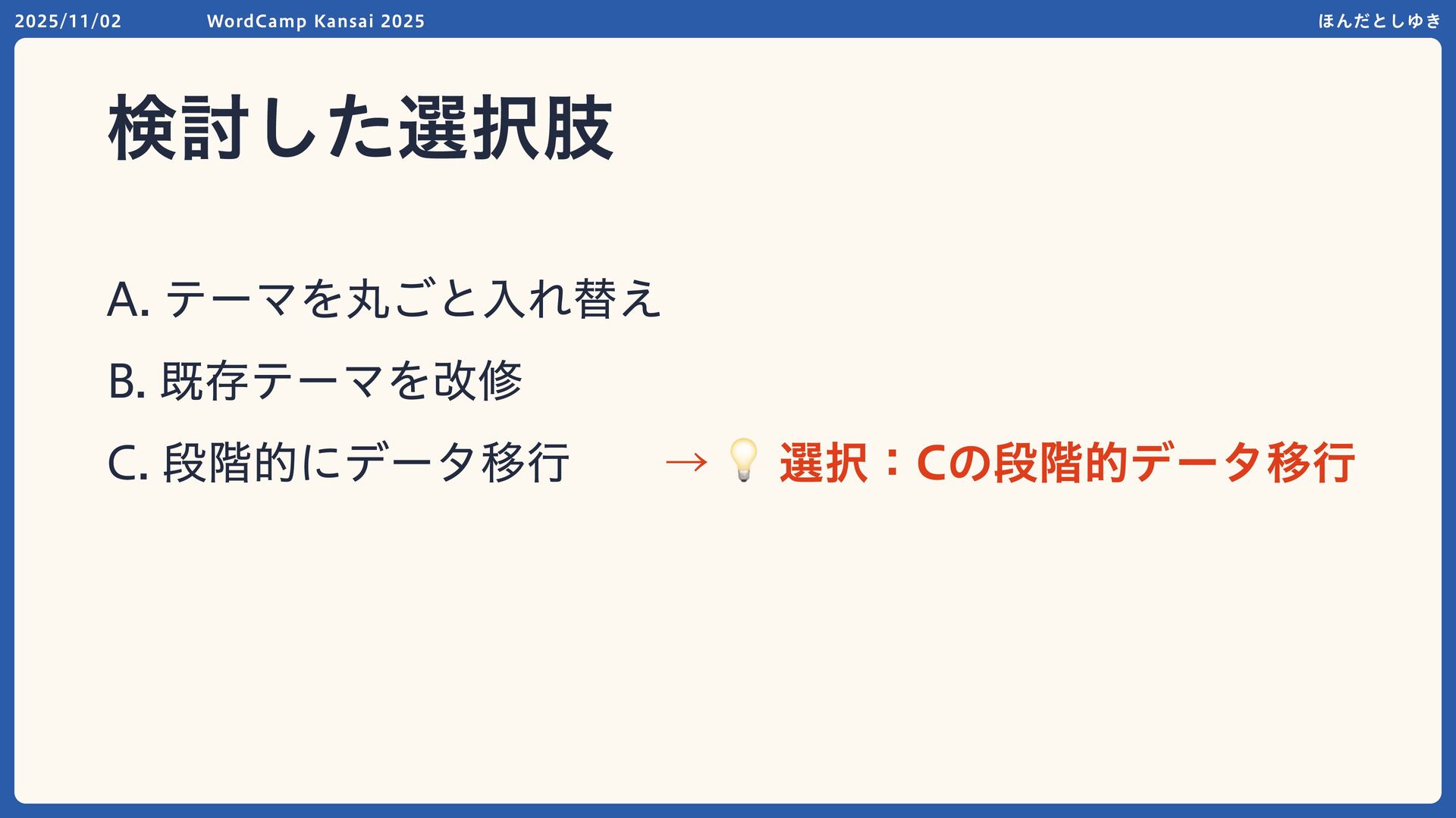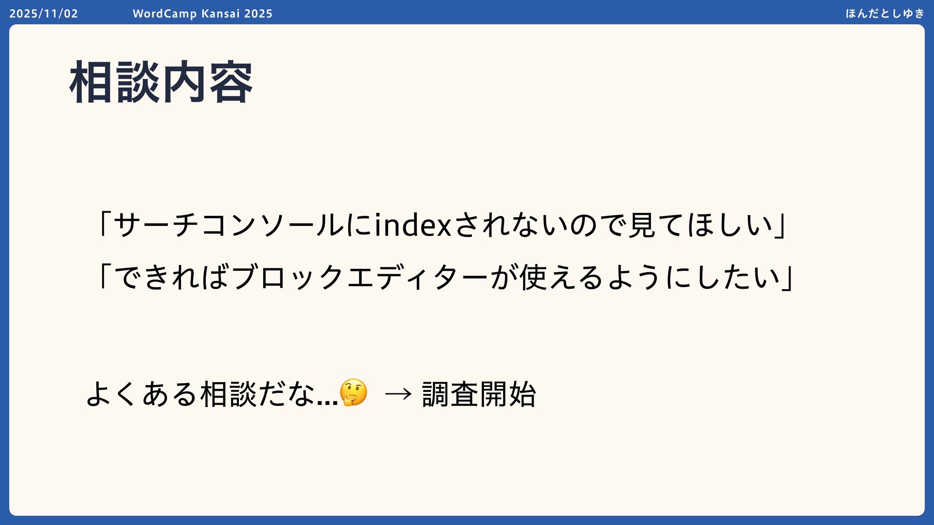 page-{slug}.phpにハードコーディングされた内容や、ページタイトル、アイキャッチ、カテゴリー、コンテンツ部分が全部ACFで定義されたカスタムフィールドになっているなど、現場で遭遇したレガシーな実装をAIの力も借りながら、ブロックエディター対応にした実際の事例をお話ししました。