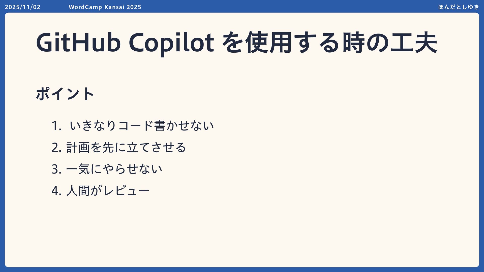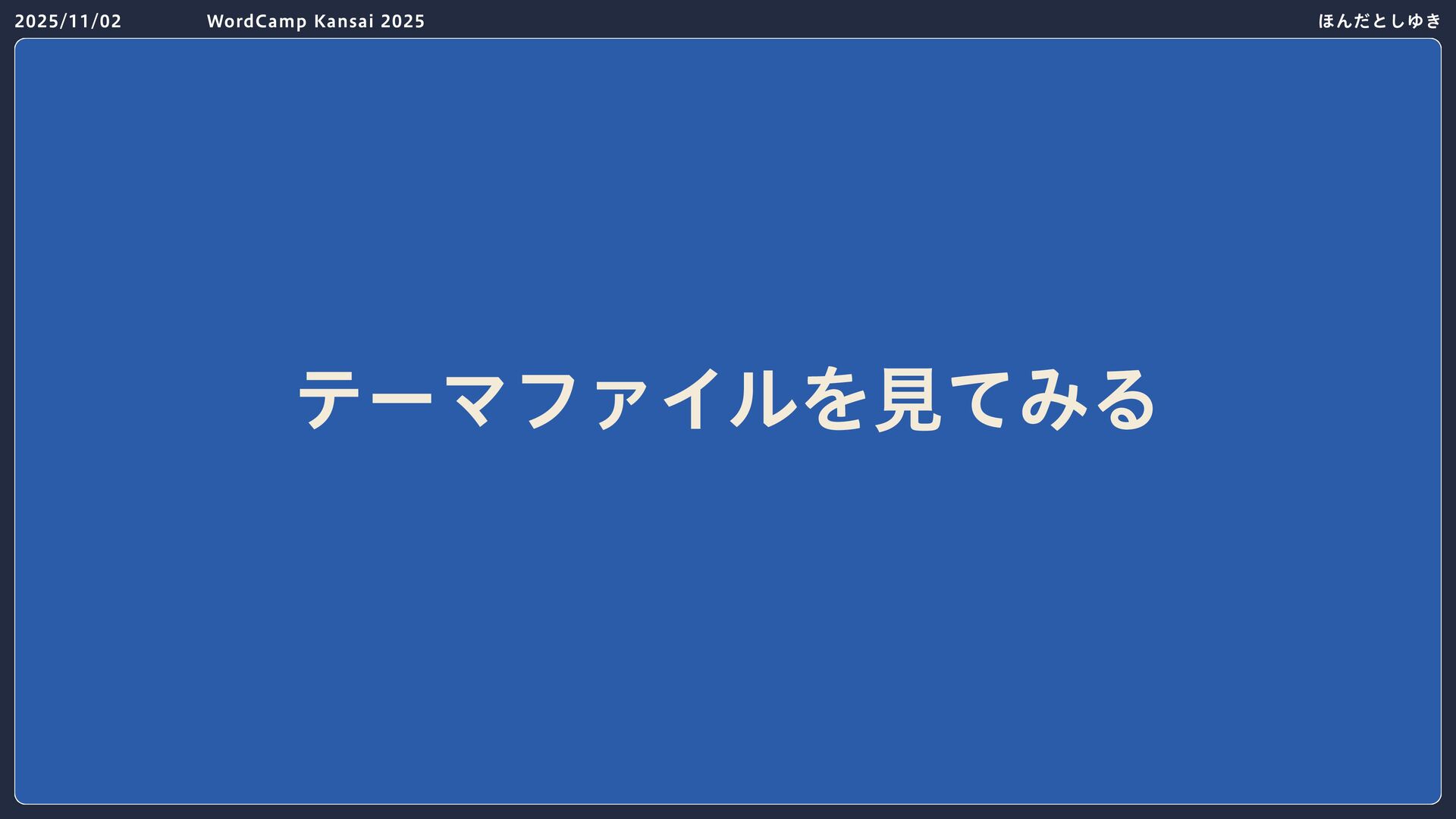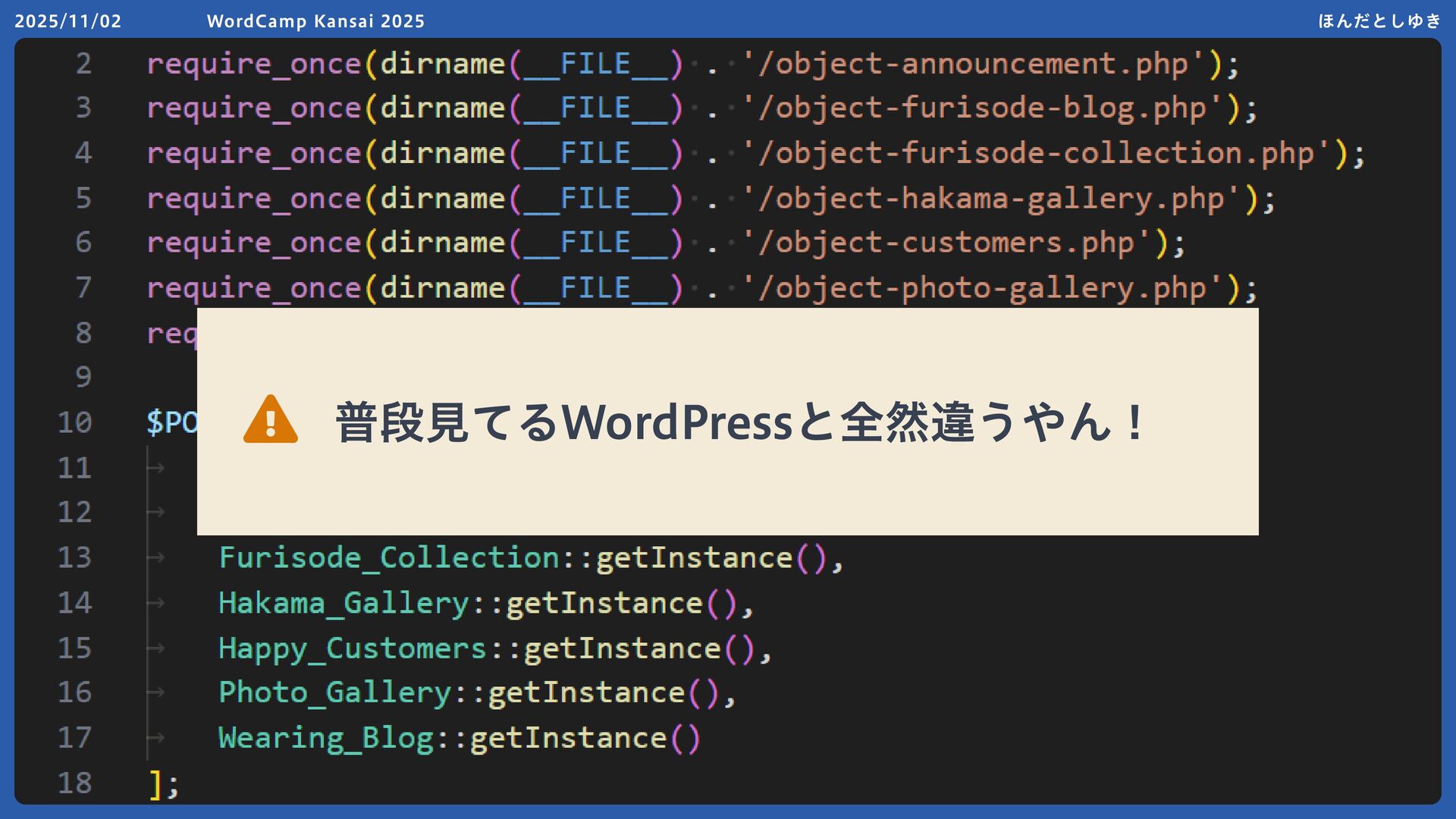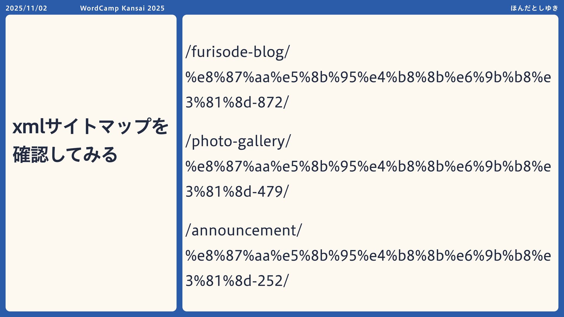 page-{slug}.phpにハードコーディングされた内容や、ページタイトル、アイキャッチ、カテゴリー、コンテンツ部分が全部ACFで定義されたカスタムフィールドになっているなど、現場で遭遇したレガシーな実装をAIの力も借りながら、ブロックエディター対応にした実際の事例をお話ししました。