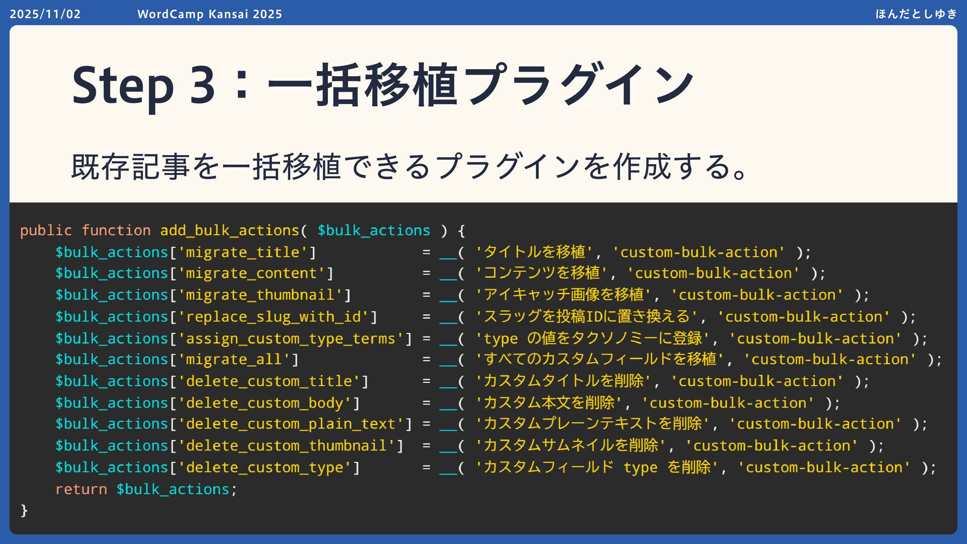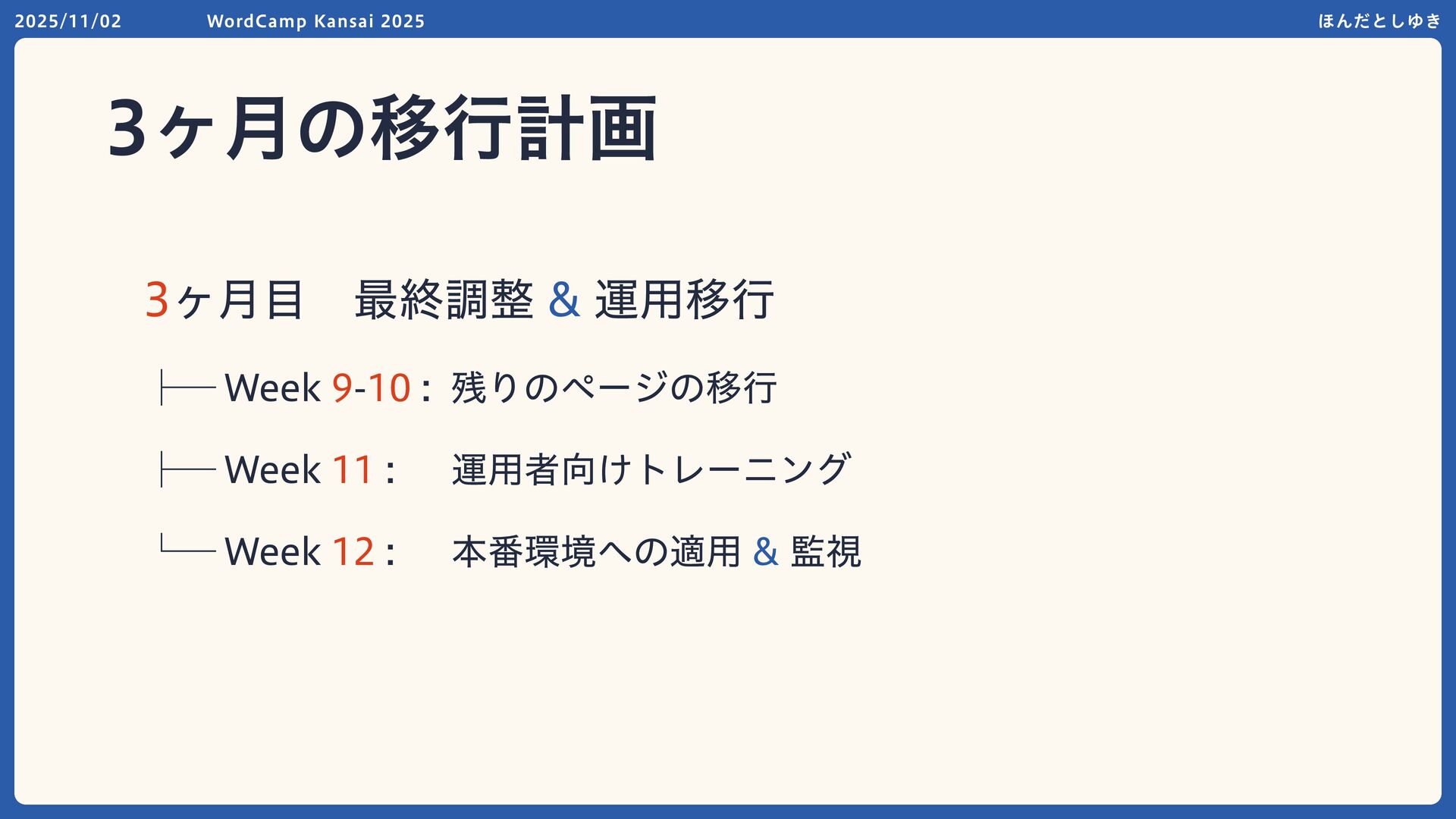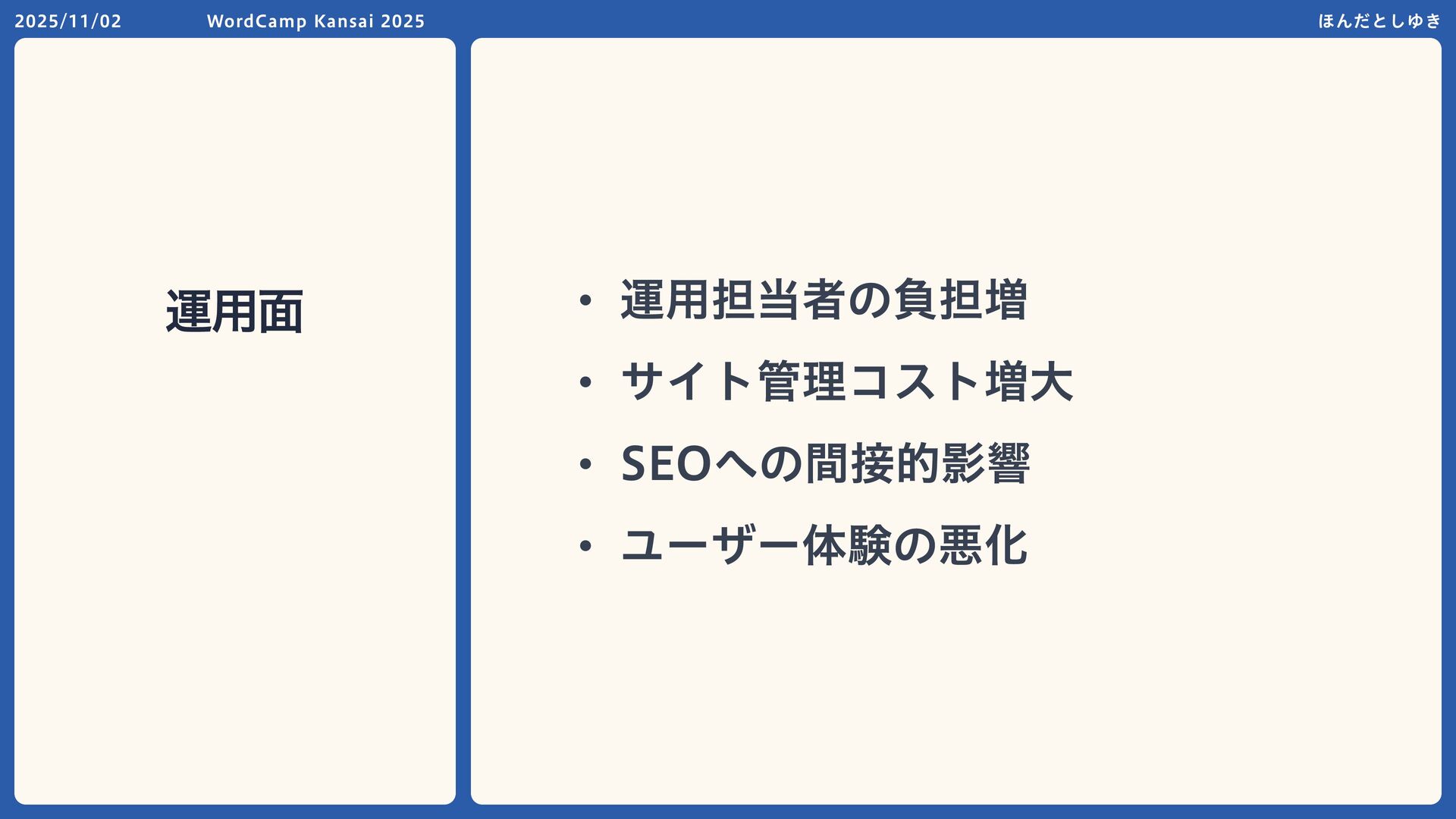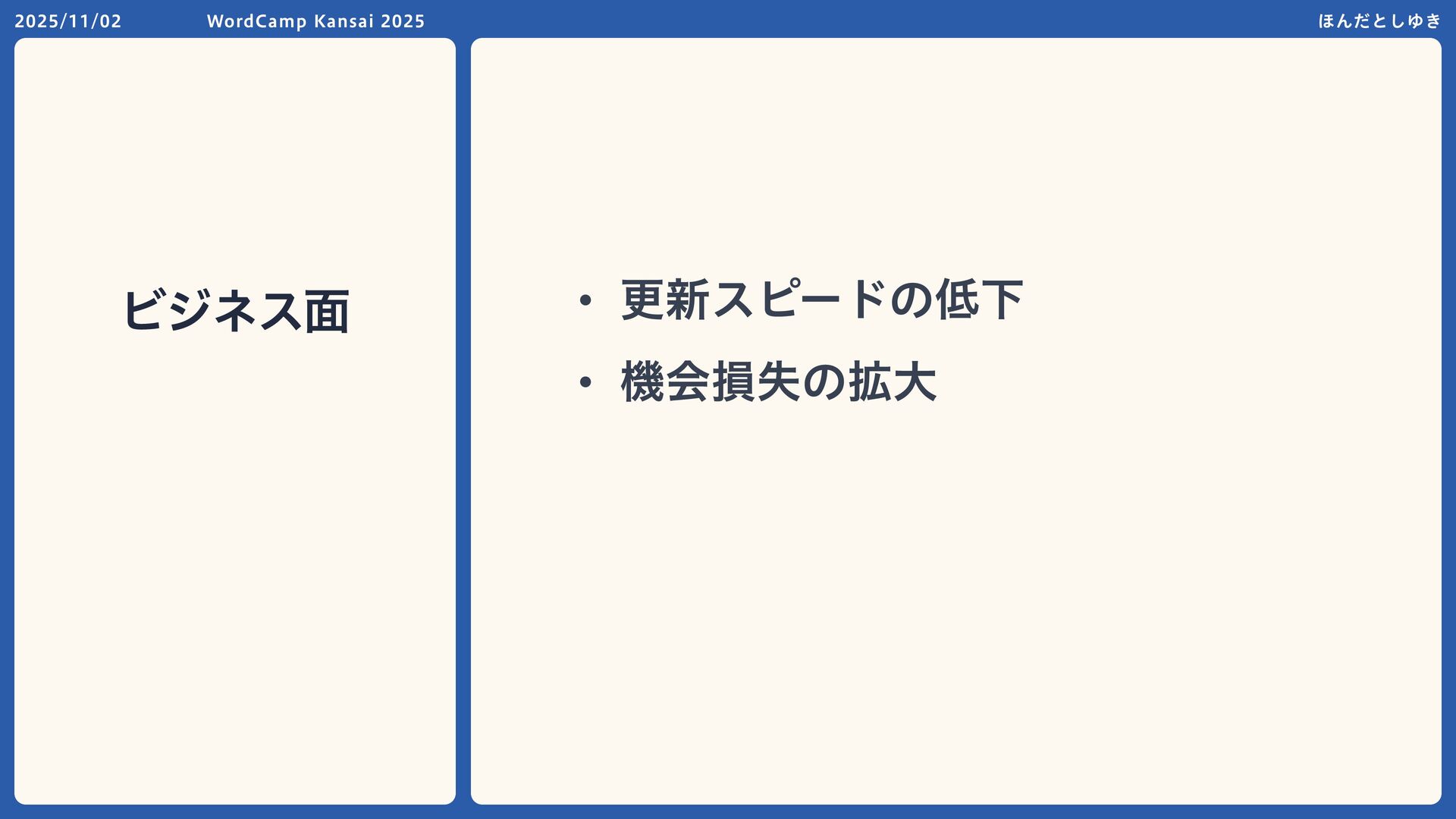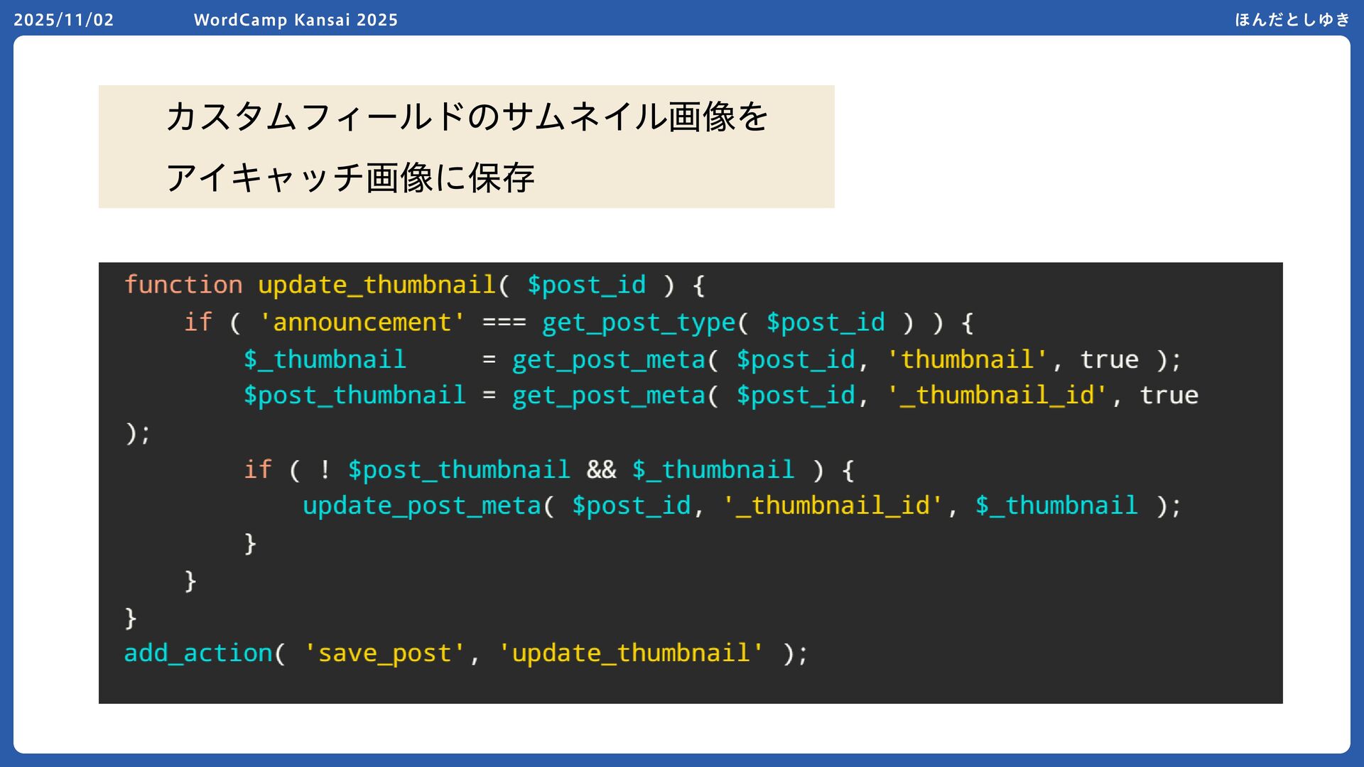 page-{slug}.phpにハードコーディングされた内容や、ページタイトル、アイキャッチ、カテゴリー、コンテンツ部分が全部ACFで定義されたカスタムフィールドになっているなど、現場で遭遇したレガシーな実装をAIの力も借りながら、ブロックエディター対応にした実際の事例をお話ししました。