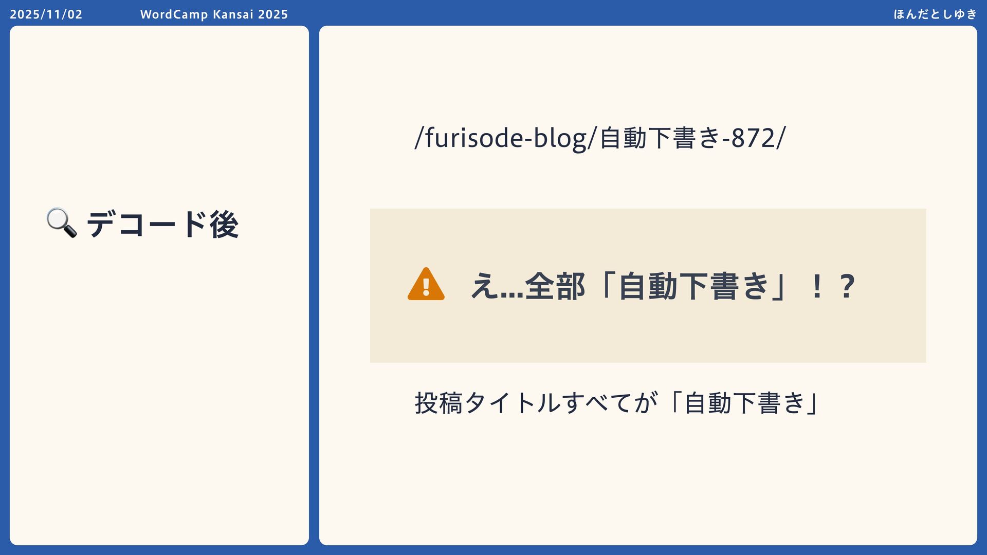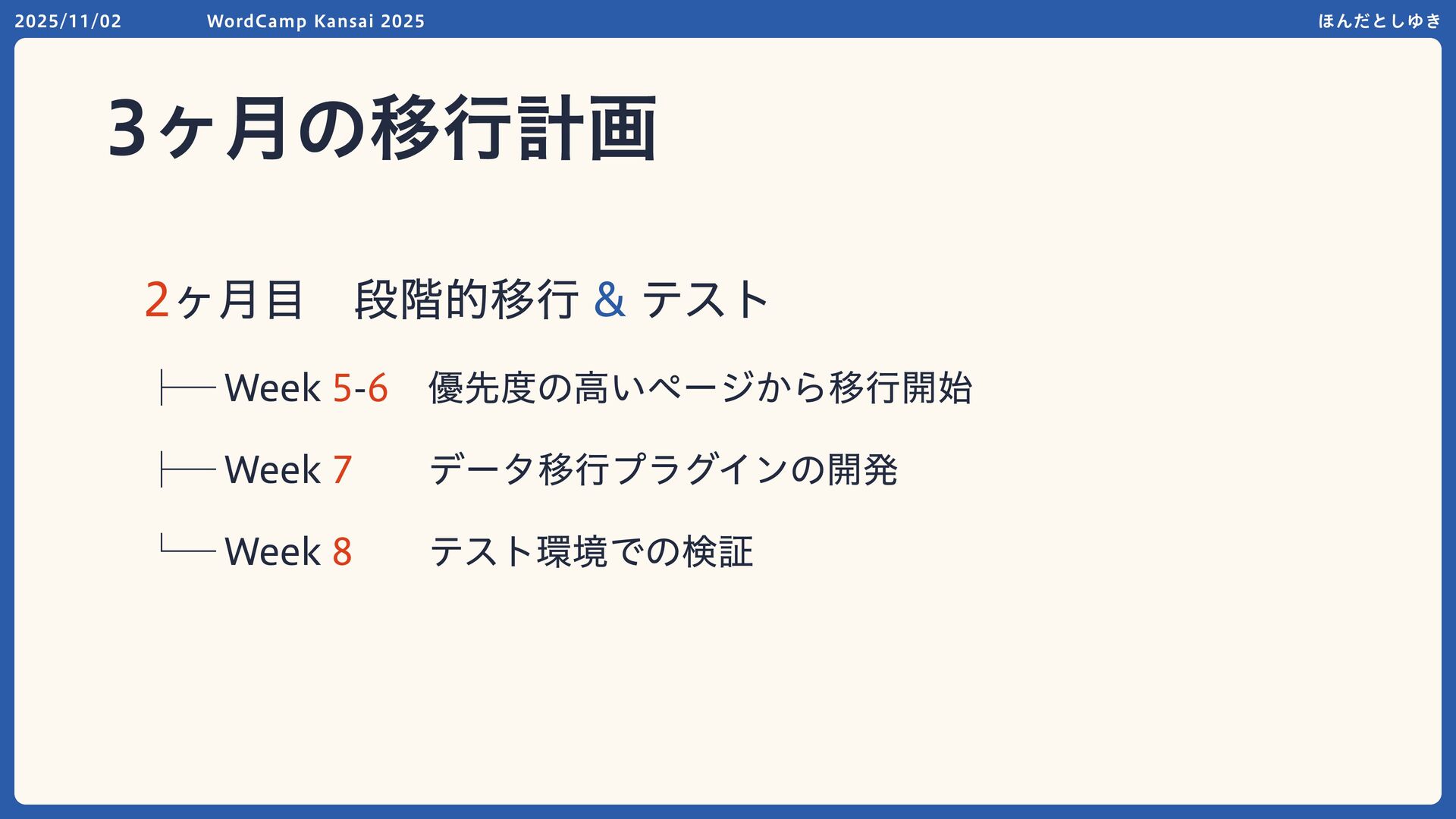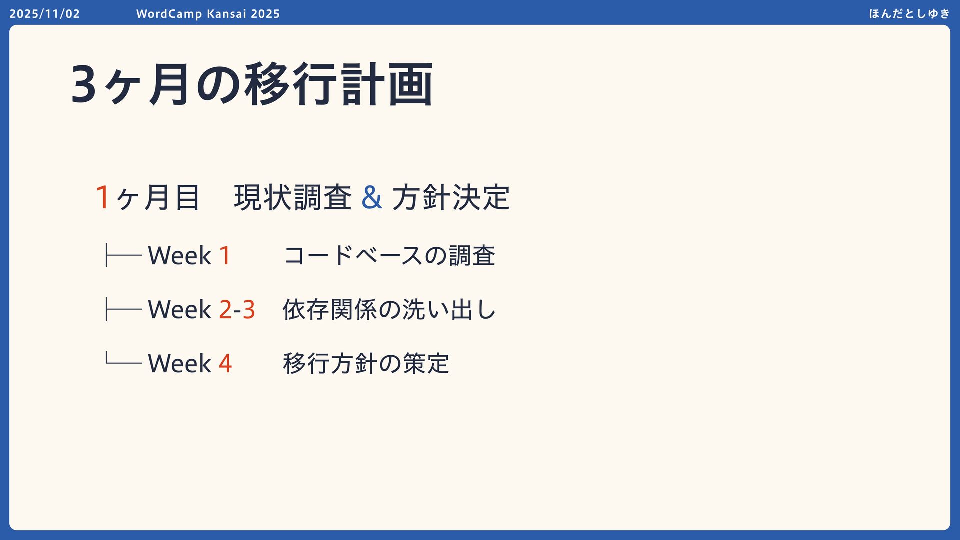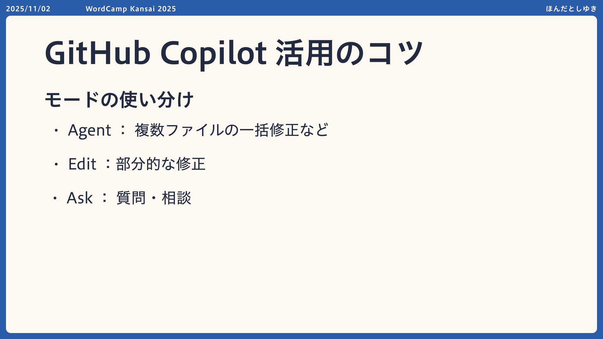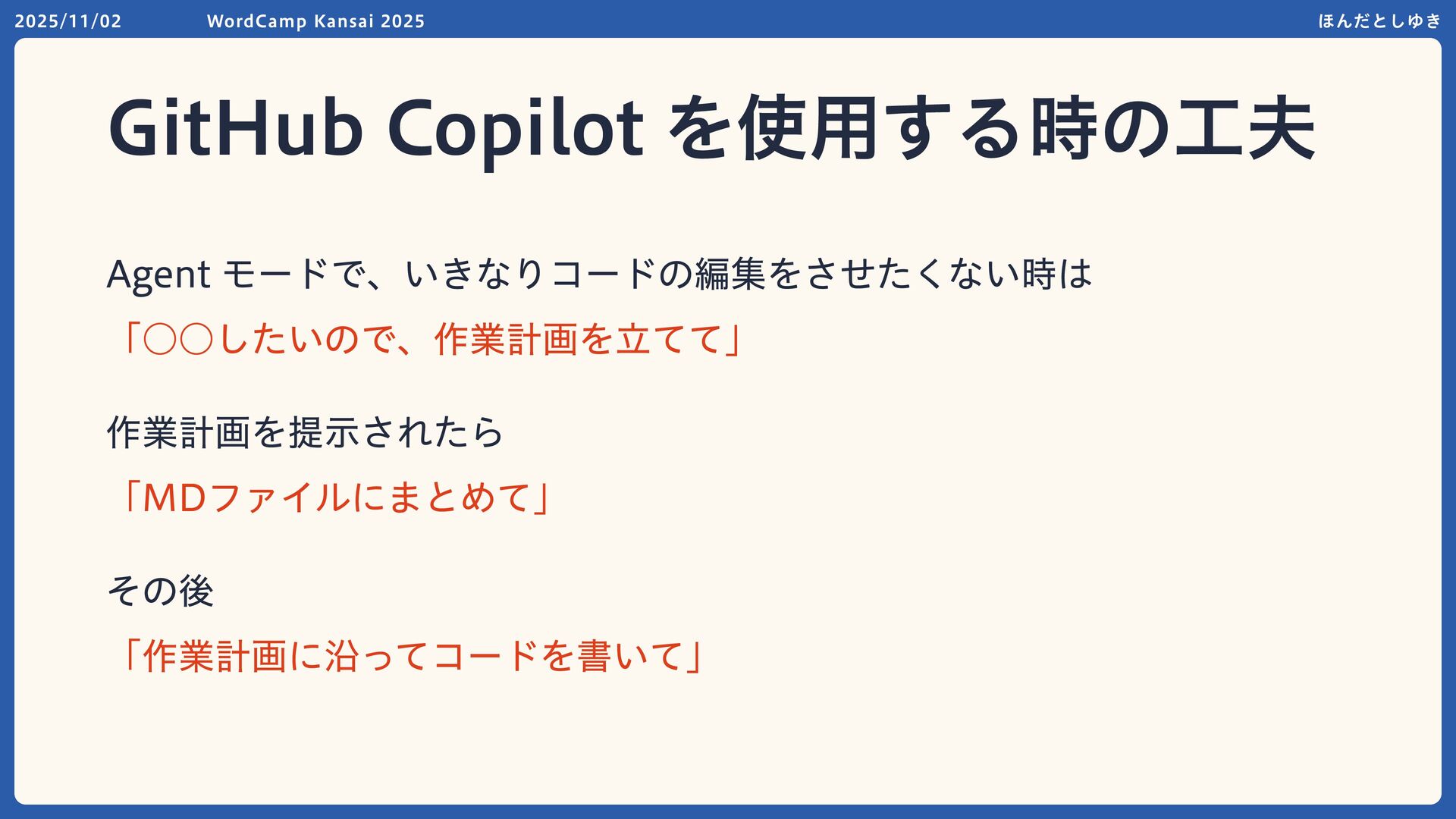 page-{slug}.phpにハードコーディングされた内容や、ページタイトル、アイキャッチ、カテゴリー、コンテンツ部分が全部ACFで定義されたカスタムフィールドになっているなど、現場で遭遇したレガシーな実装をAIの力も借りながら、ブロックエディター対応にした実際の事例をお話ししました。