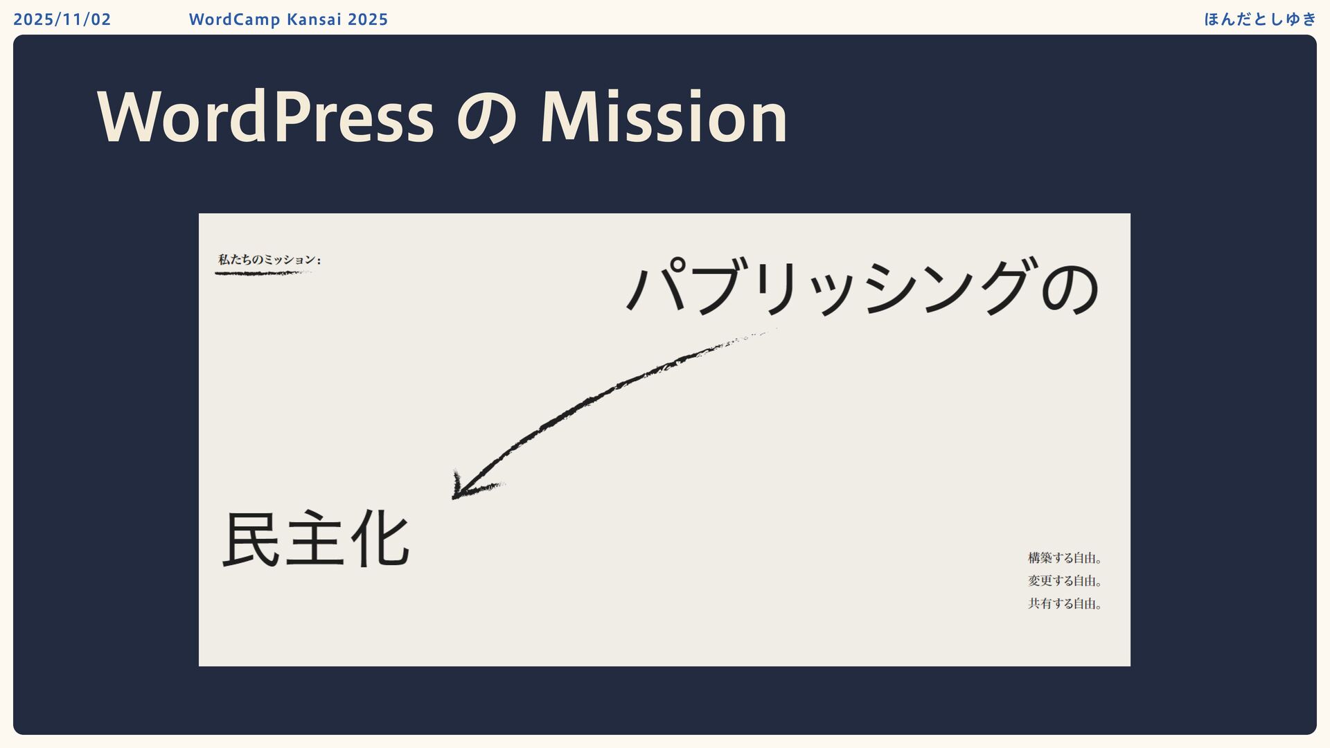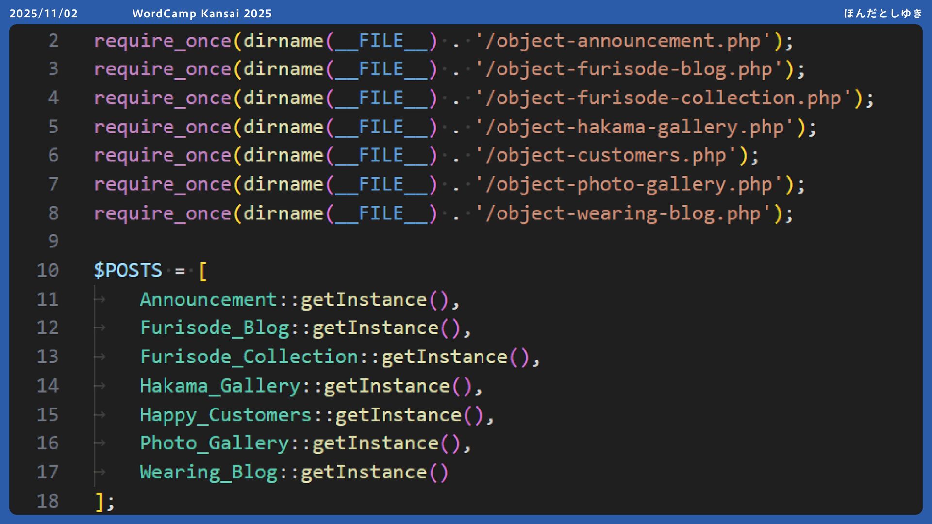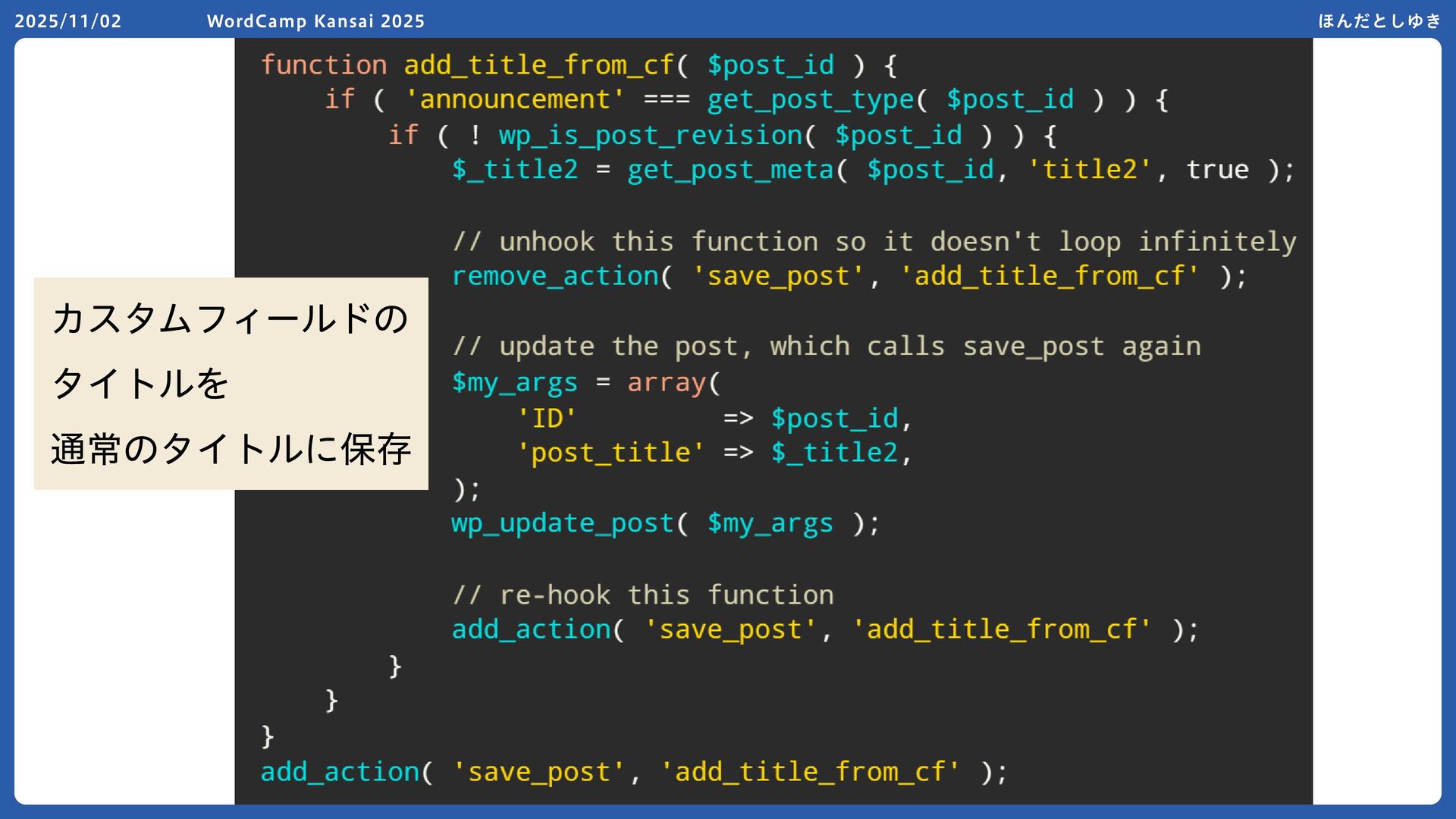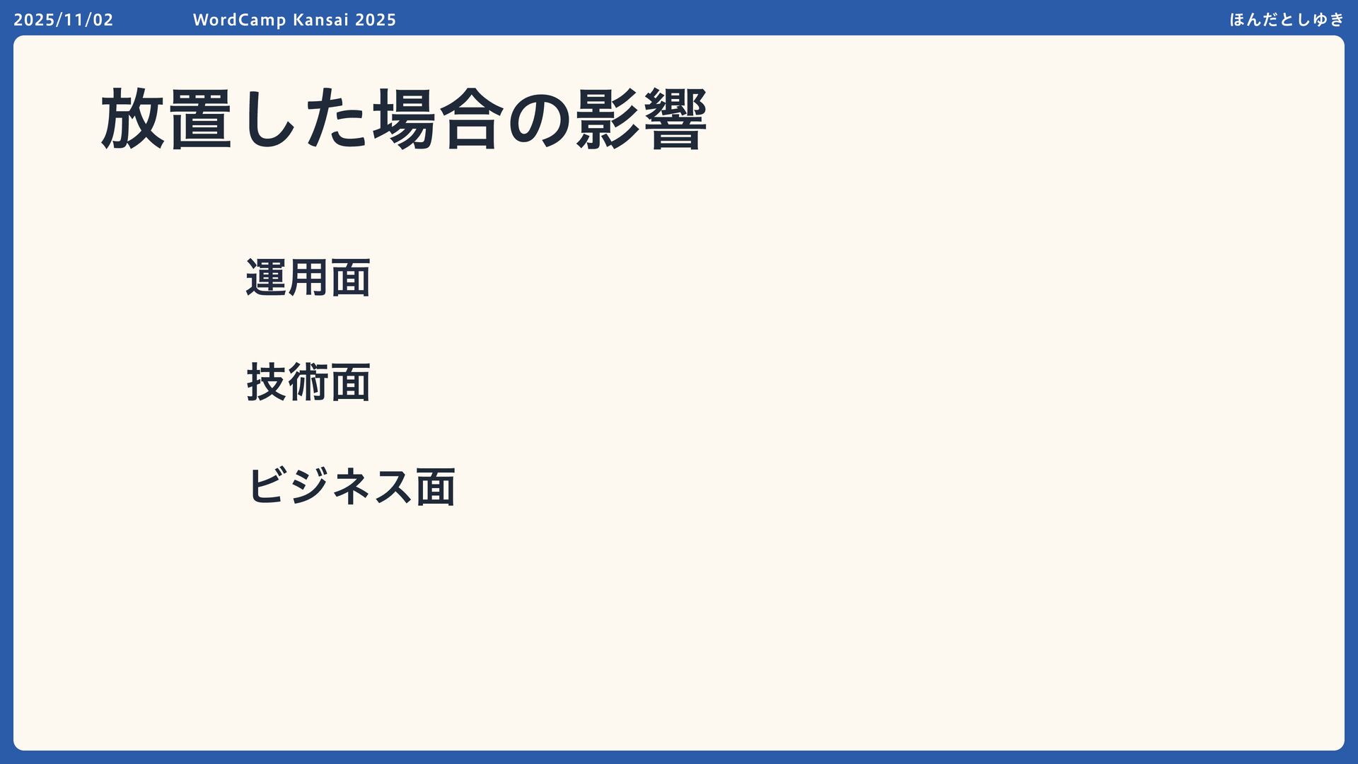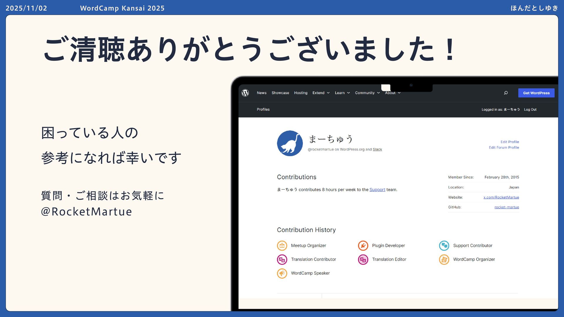 page-{slug}.phpにハードコーディングされた内容や、ページタイトル、アイキャッチ、カテゴリー、コンテンツ部分が全部ACFで定義されたカスタムフィールドになっているなど、現場で遭遇したレガシーな実装をAIの力も借りながら、ブロックエディター対応にした実際の事例をお話ししました。