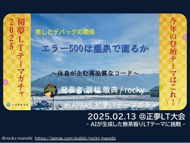 AIが生成した無茶振りLTテーマに挑む「正夢LT大会」の発表資料です。 温泉を活用した、誰もが習得でき、確実な結果を生み出す、極めて実践的なプラクティスを紹介しています。 https://lapras.connpass.com/event/342046/