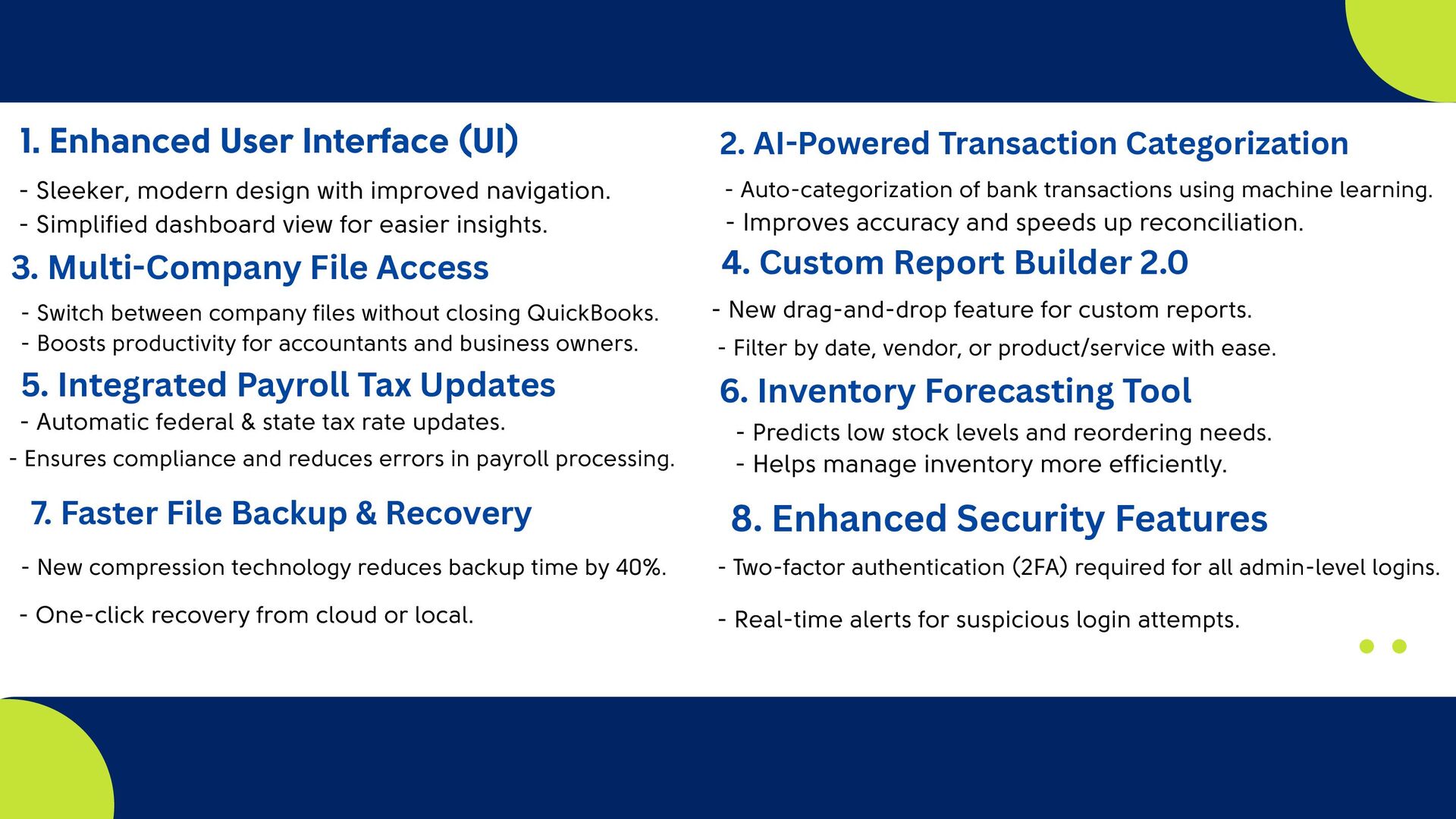 improved navigation. - Simplified dashboard view for easier insights. 2. AI-Powered Transaction Categorization 3. Multi-Company File Access - Auto-categorization of bank transactions using machine learning. - Improves accuracy and speeds up reconciliation. - Switch between company files without closing QuickBooks. 4. Custom Report Builder 2.0 - New drag-and-drop feature for custom reports. - Automatic federal & state tax rate updates. 5. Integrated Payroll Tax Updates 6. Inventory Forecasting Tool - Ensures compliance and reduces errors in payroll processing. - Predicts low stock levels and reordering needs. - Helps manage inventory more efficiently. 7. Faster File Backup & Recovery - Boosts productivity for accountants and business owners. - Filter by date, vendor, or product/service with ease. - New compression technology reduces backup time by 40%. - One-click recovery from cloud or local. 8. Enhanced Security Features - Two-factor authentication (2FA) required for all admin-level logins. - Real-time alerts for suspicious login attempts.