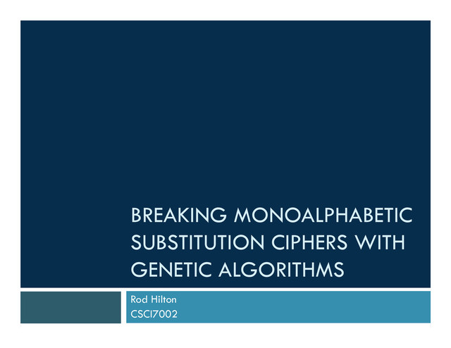 Fathy Saad Holail, Bahaa Eldin, M. Hasan, and Mohammed Z. Abd El-mageed, A genetic algorithm for cryptanalysis with application to des-like systems, 2006. ¨ Abdelwadood Mesleh, Bilal Zahran, Anwar Al-Abadi, Samer Hamed, Nawal Al- Zabin, Heba Bargouthi, and Iman Maharmeh, Genetic cryptanalysis, Networked Digital Technologies, Communications in Computer and Information Science, vol. 87, Springer Berlin Heidelberg, 2010, pp. 321–332. ¨ S.S. Omran, A.S. Al-Khalid, and D.M. Al-Saady, Using genetic algorithm to break a mono - alphabetic substitution cipher, Open Systems (ICOS), 2010 IEEE Conference on, dec. 2010, pp. 63 –67. ¨ S.S. Omran, A.S. Al-Khalid, and D.M. Al-Saady, A cryptanalytic attack on vigenere cipher using genetic algorithm, Open Systems (ICOS), 2011 IEEE Conference on, sept. 2011, pp. 59 –64.