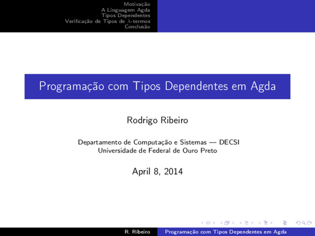 λ-termos Conclusão Programação com Tipos Dependentes em Agda Rodrigo Ribeiro Departamento de Computação e Sistemas — DECSI Universidade de Federal de Ouro Preto April 8, 2014 R. Ribeiro Programação com Tipos Dependentes em Agda