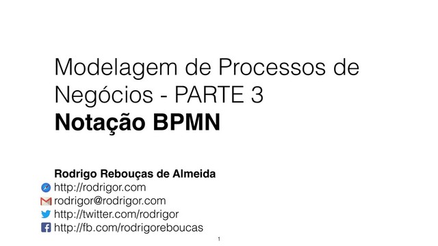 de processos de negócios. Se você ou sua empresa tiverem interesse em um treinamento sobre como identificar, modelar, analisar e otimizar processos de negócios, entre em contato. http://rodrigor.com [email protected]