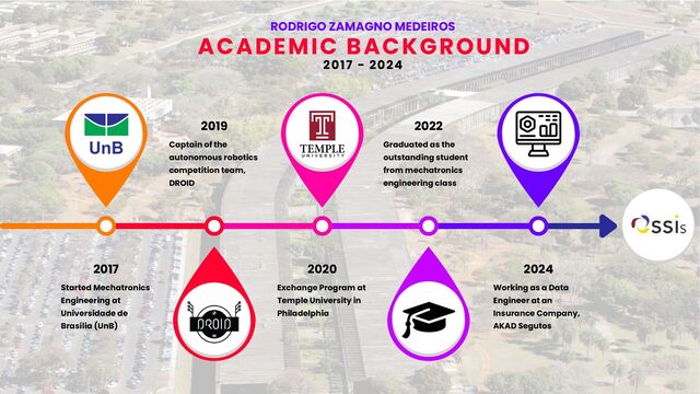 2017 - 2024 Started Mechatronics Engineering at Universidade de Brasília (UnB) Captain of the autonomous robotics competition team, DROID Graduated as the outstanding student from mechatronics engineering class Exchange Program at Temple University in Philadelphia Working as a Data Engineer at an Insurance Company, AKAD Segutos
