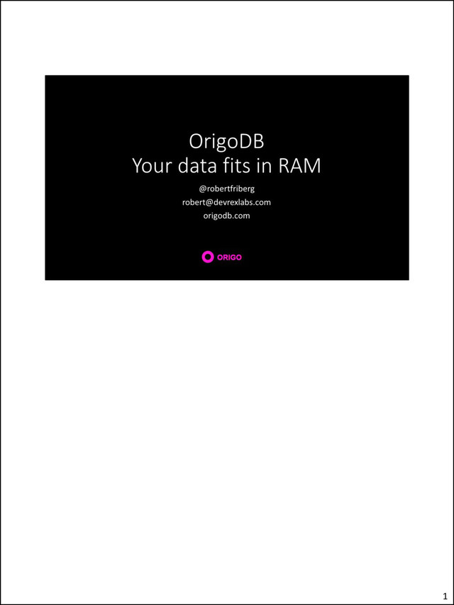 VoltDB, Raven • Naming. LiveDomain -> LiveDB -> OrigoDB What is OrigoDB? OrigoDB is an in-memory database toolkit. The core component is the Engine. The engine is 100% ACID, runs in-process and hosts a user defined data model. The data model can be domain specific or generic and is defined using plain old NET types. Persistence is based on snapshots and write-ahead command logging to the underlying storage. The Model • is an instance of the user defined data model • lives in RAM only • is the data • is a projection of the entire sequence of commands applied to the initial model, usually empty. • can only be accessed through the engine The Client • has no direct reference to the model • interacts directly with the Engine either in-process or remote • or indirectly via a proxy with the same interface as the model • passes query and command objects to the engine The Engine The Engine encapsulates an instance of the model and is responsible for atomicity, consistency, isolation and durability. It performs the following tasks: • writes commands to the journal • executes commands and queries • reads and writes snapshots • restores the model on startup We call it a toolkit because you have a lot of options • Modelling - define your own model or use an existing one. Generic or domain specific. It’s up to you. • Storage - Default is FileStore. SqlStore or write your own module. • Data format - Choose wire and storage format by plugging in different IFormatter implementations. Binary, JSON, ProtoBuf, etc Read more in the docs on Extensibility Design goals Our initial design goals were focused on rapid development, testability, simplicity, correctness, modularity, flexibility and extensibility. Performance was never a goal but running in-memory with memory optimized data structures outperforms any disk oriented system. But of course a lot of optimization is possible. 11