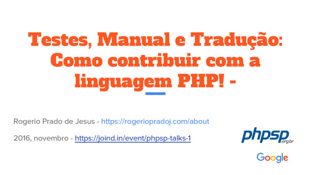 - Rogerio Prado de Jesus - https://rogeriopradoj.com/about 2016, novembro - https://joind.in/event/phpsp-talks-1