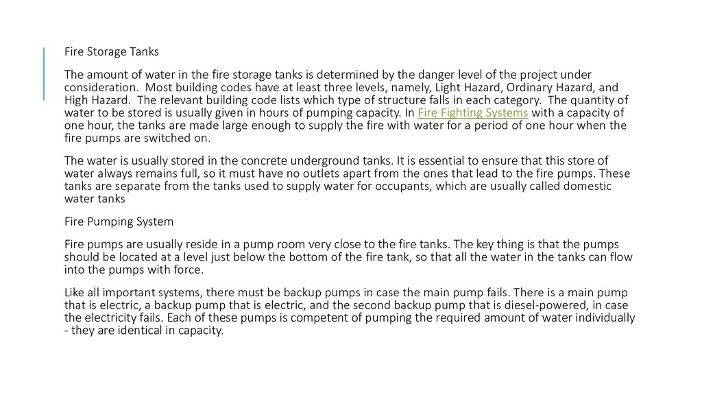 storage tanks is determined by the danger level of the project under consideration. Most building codes have at least three levels, namely, Light Hazard, Ordinary Hazard, and High Hazard. The relevant building code lists which type of structure falls in each category. The quantity of water to be stored is usually given in hours of pumping capacity. In Fire Fighting Systems with a capacity of one hour, the tanks are made large enough to supply the fire with water for a period of one hour when the fire pumps are switched on. The water is usually stored in the concrete underground tanks. It is essential to ensure that this store of water always remains full, so it must have no outlets apart from the ones that lead to the fire pumps. These tanks are separate from the tanks used to supply water for occupants, which are usually called domestic water tanks Fire Pumping System Fire pumps are usually reside in a pump room very close to the fire tanks. The key thing is that the pumps should be located at a level just below the bottom of the fire tank, so that all the water in the tanks can flow into the pumps with force. Like all important systems, there must be backup pumps in case the main pump fails. There is a main pump that is electric, a backup pump that is electric, and the second backup pump that is diesel-powered, in case the electricity fails. Each of these pumps is competent of pumping the required amount of water individually - they are identical in capacity.