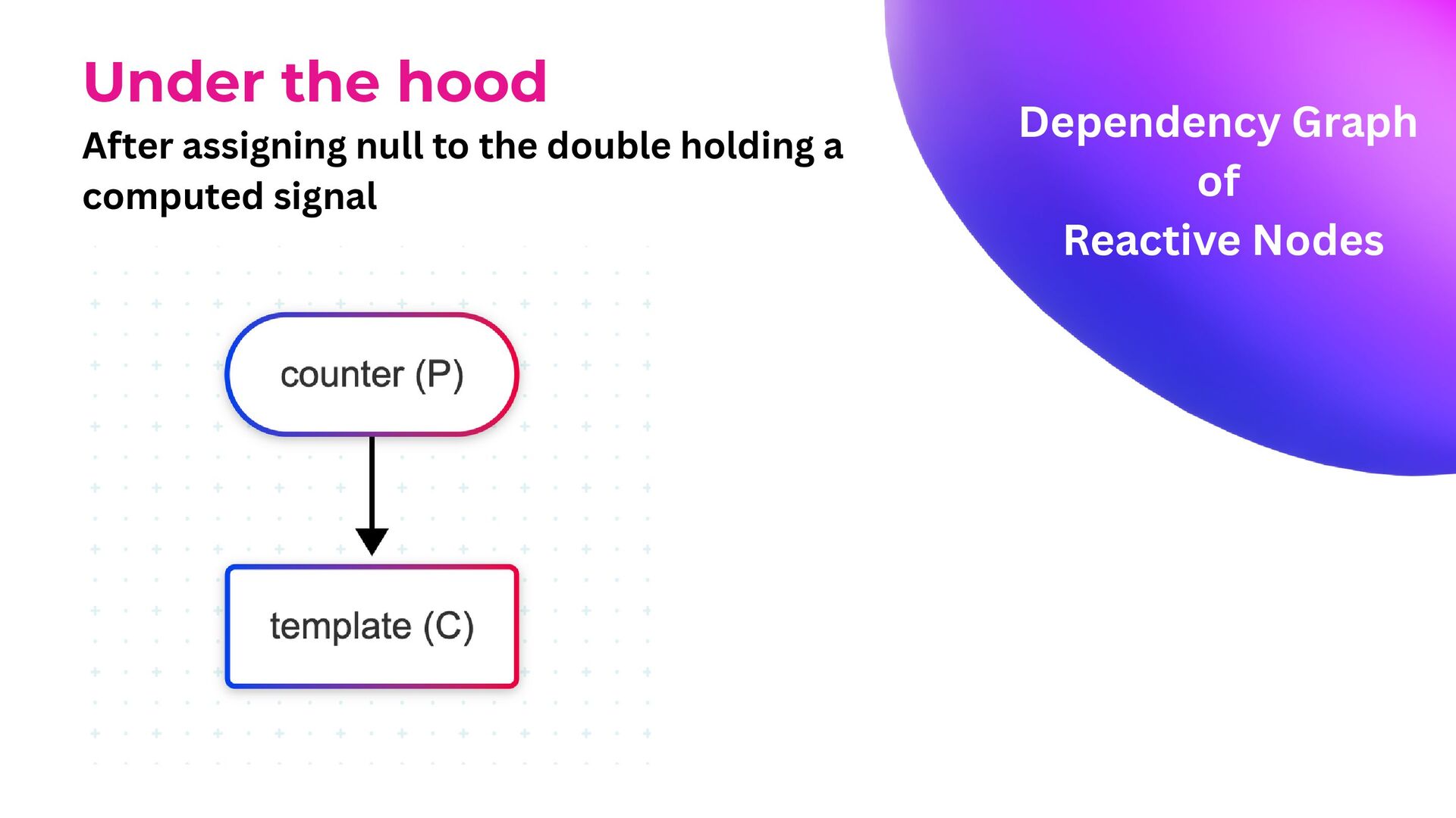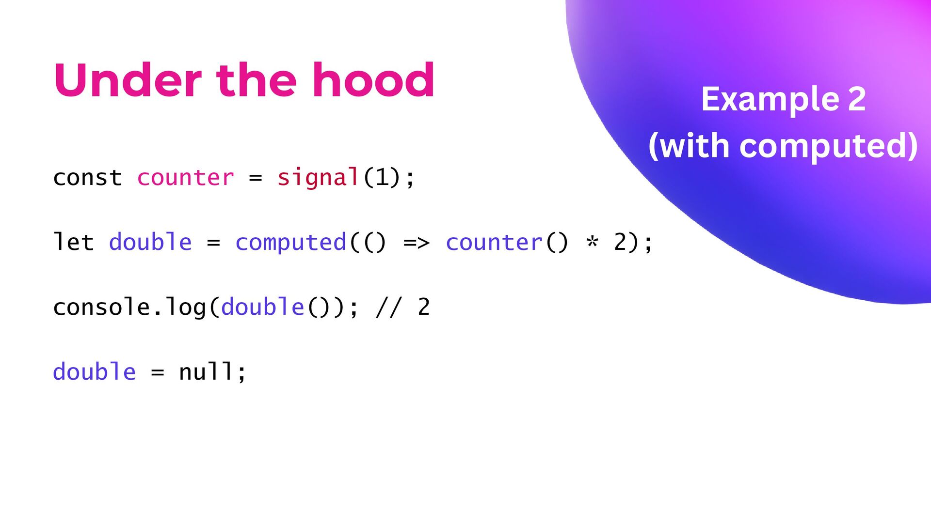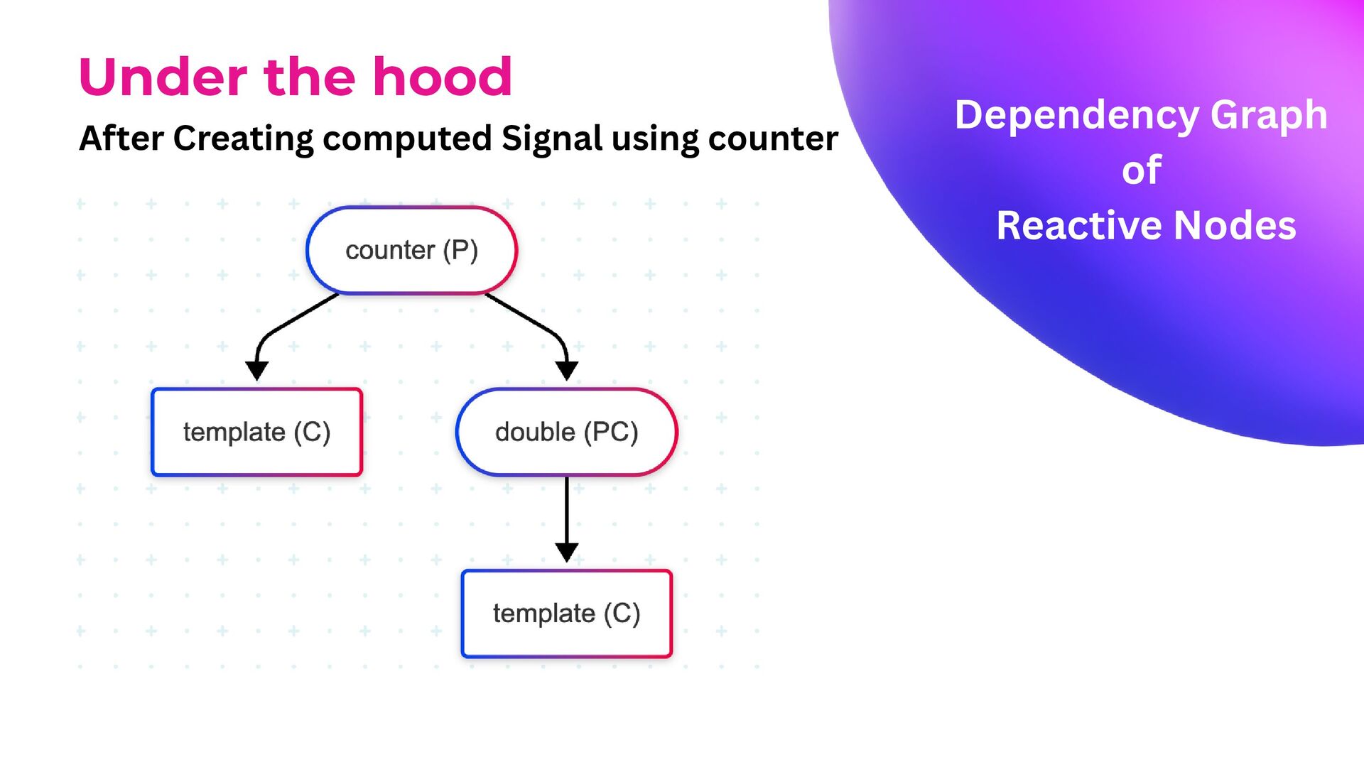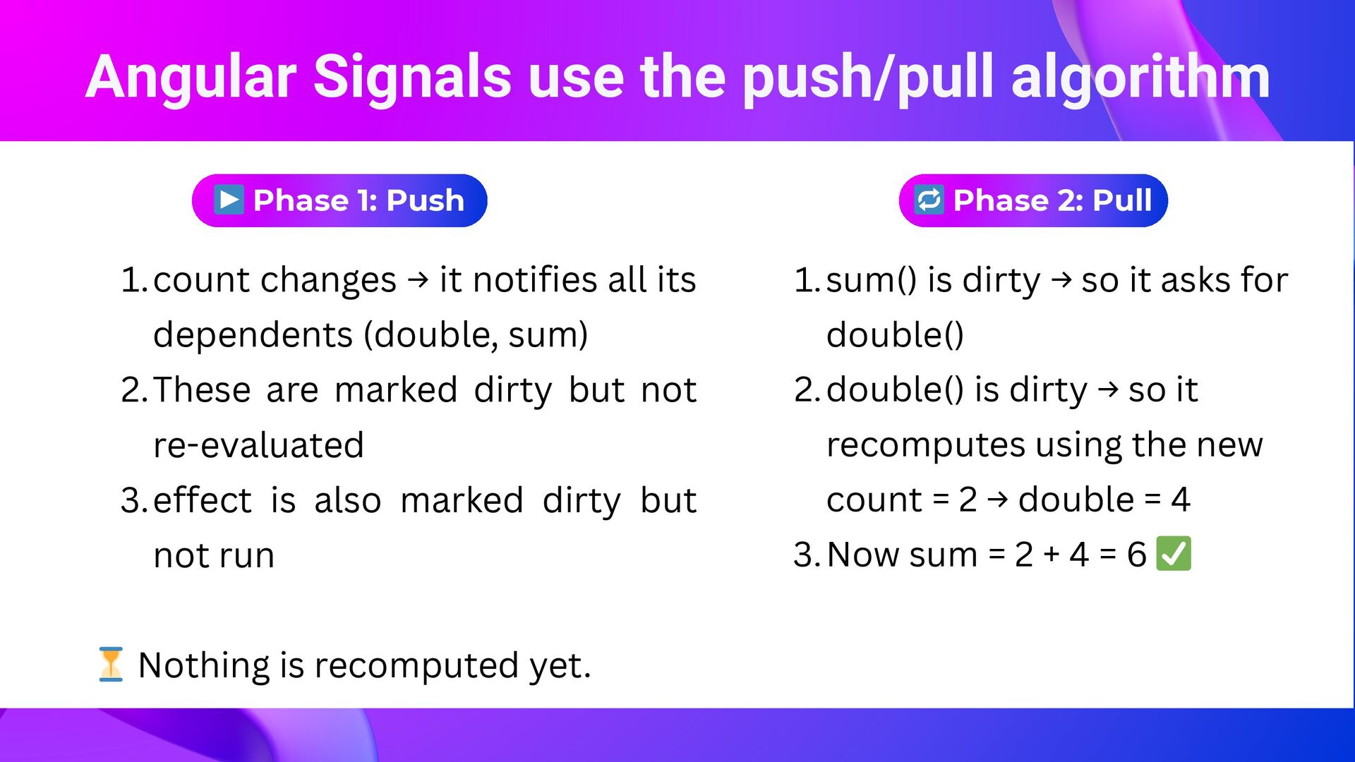 use the push/pull algorithm 1.sum() is dirty → so it asks for double() 2.double() is dirty → so it recomputes using the new count = 2 → double = 4 3.Now sum = 2 + 4 = 6 ✅ 1.count changes → it notifies all its dependents (double, sum) 2.These are marked dirty but not re-evaluated 3.effect is also marked dirty but not run ⏳ Nothing is recomputed yet.