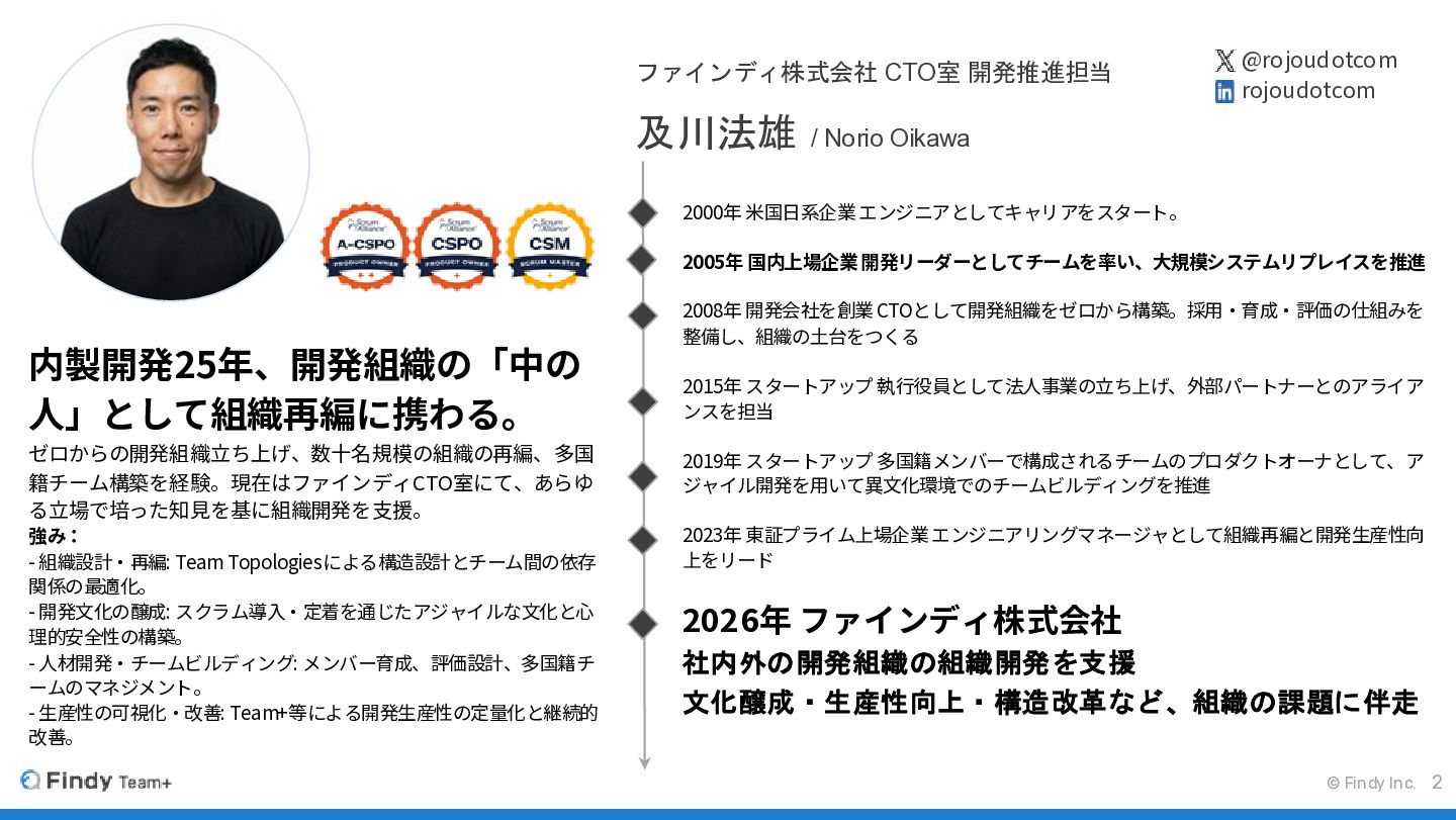 整備し、組織の土台をつくる 2015年 スタートアップ 執行役員として法人事業の立ち上げ、外部パートナーとのアライア ンスを担当 2019年 スタートアップ 多国籍メンバーで構成されるチームのプロダクトオーナとして、ア ジャイル開発を用いて異文化環境でのチームビルディングを推進 2023年 東証プライム上場企業エンジニアリングマネージャとして組織再編と開発生産性向 上をリード 2026年 ファインディ株式会社 社内外の開発組織の組織開発を支援 文化醸成・生産性向上・構造改革など、組織の課題に伴走 ファインディ株式会社 CTO室 開発推進担当 及川法雄 / Norio Oikawa @rojoudotcom rojoudotcom 内製開発25年、開発組織の「中の 人」として組織再編に携わる。 ゼロからの開発組織立ち上げ、数十名規模の組織の再編、多国 籍チーム構築を経験。現在はファインディCTO室にて、あらゆ る立場で培った知見を基に組織開発を支援。 強み: - 組織設計・再編: Team Topologiesによる構造設計とチーム間の依存 関係の最適化。 - 開発文化の醸成: スクラム導入・定着を通じたアジャイルな文化と心 理的安全性の構築。 - 人材開発・チームビルディング: メンバー育成、評価設計、多国籍チ ームのマネジメント。 - 生産性の可視化・改善: Team+等による開発生産性の定量化と継続的 改善。 2