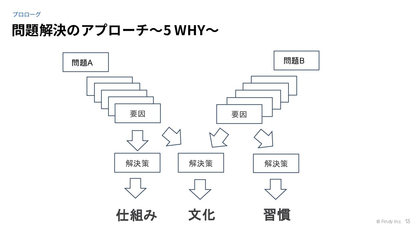 © Findy Inc. 13 問題解決のアプローチ〜5 WHY〜 プロローグ 要因 解決策 解決策