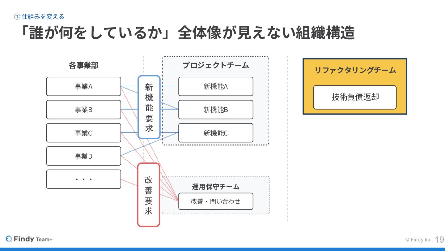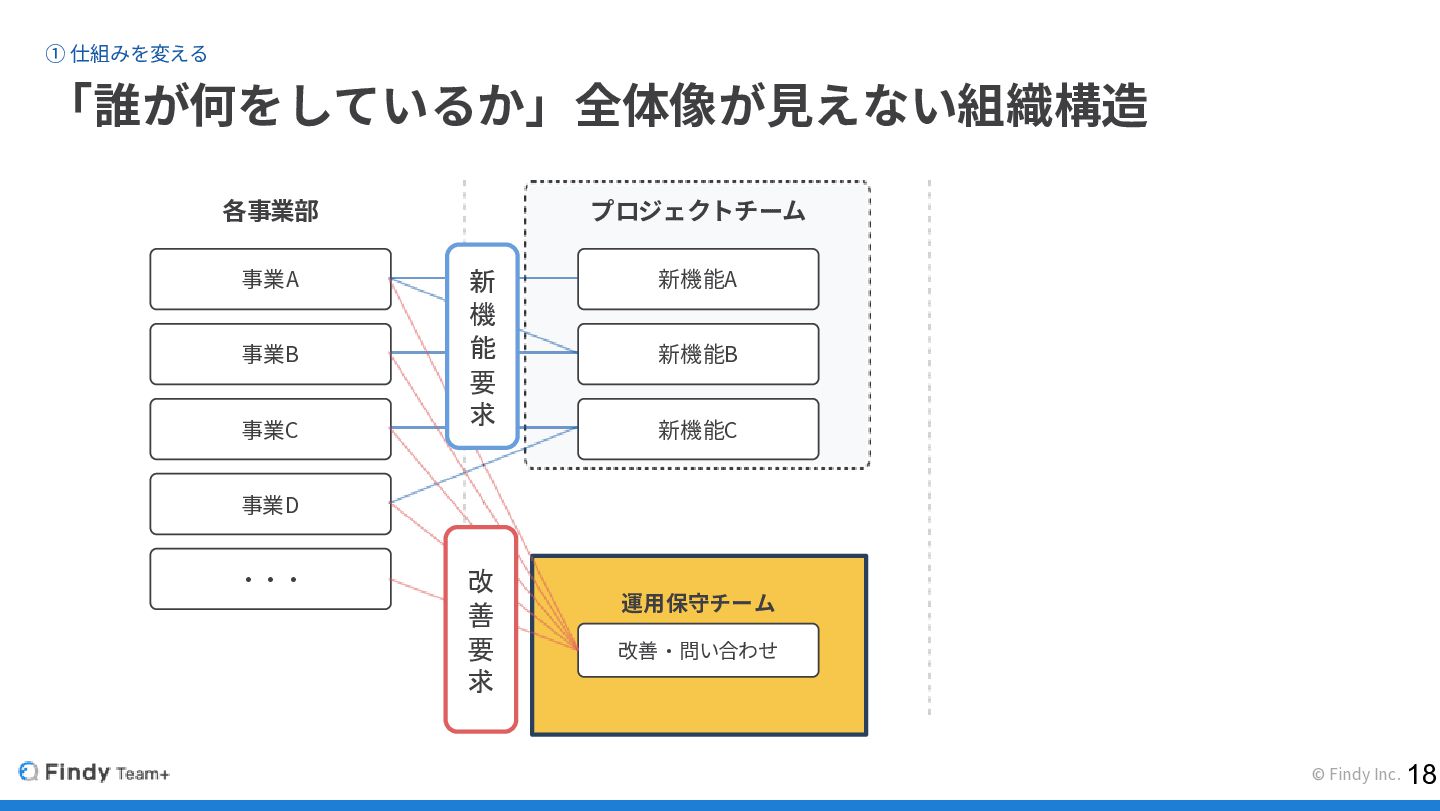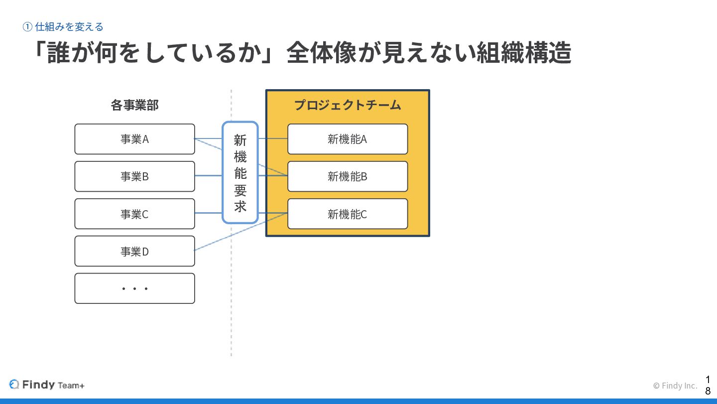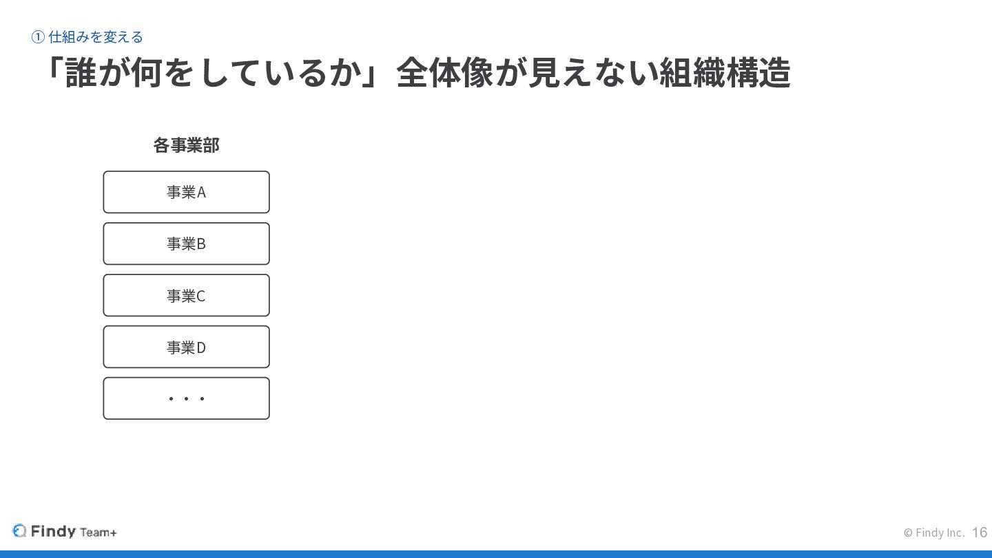 © Findy Inc. ① 仕組みを変える 「誰が何をしているか」全体像が見えない組織構造 各事業部 プロジェクトチーム 事業A 事業B