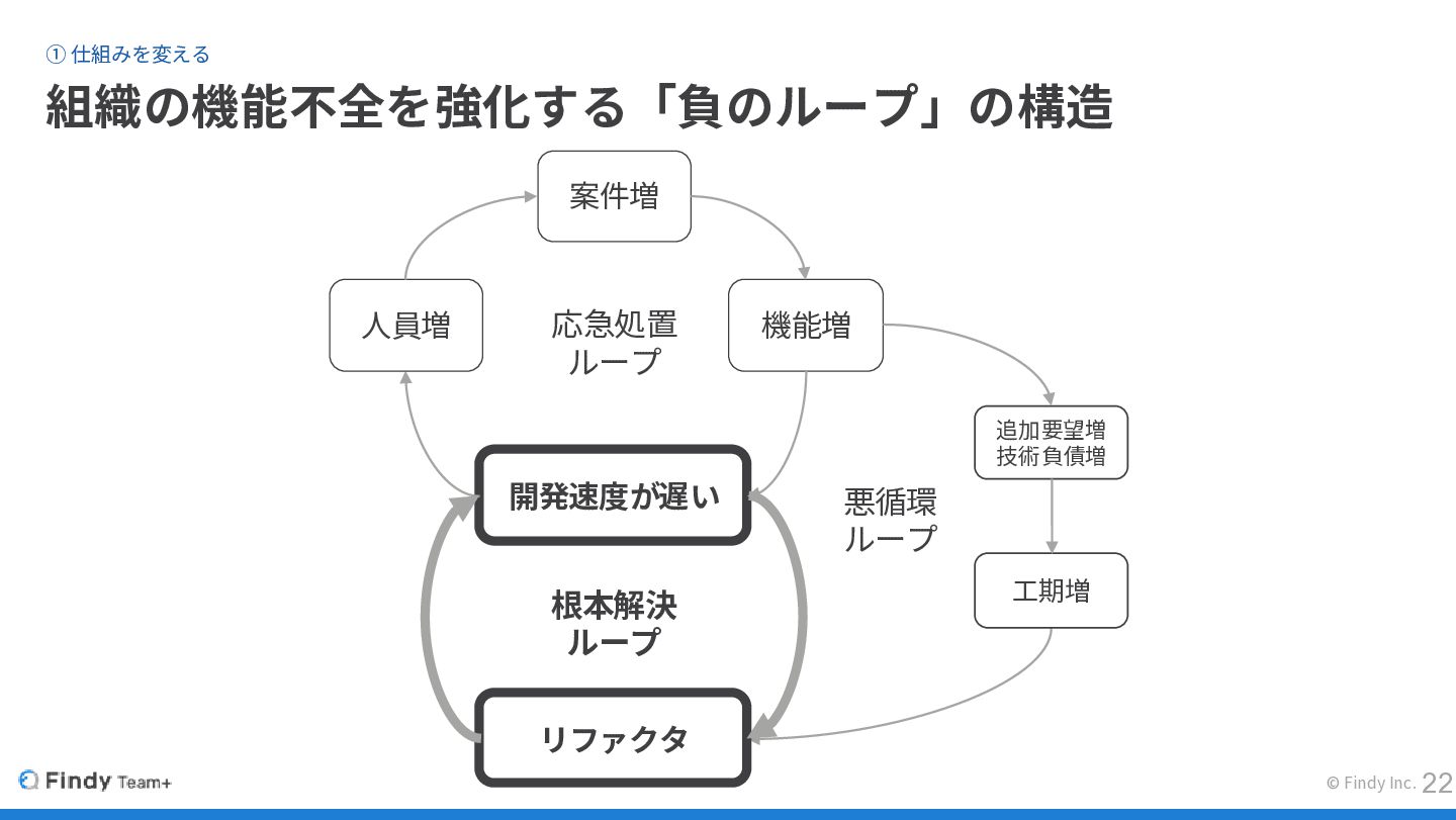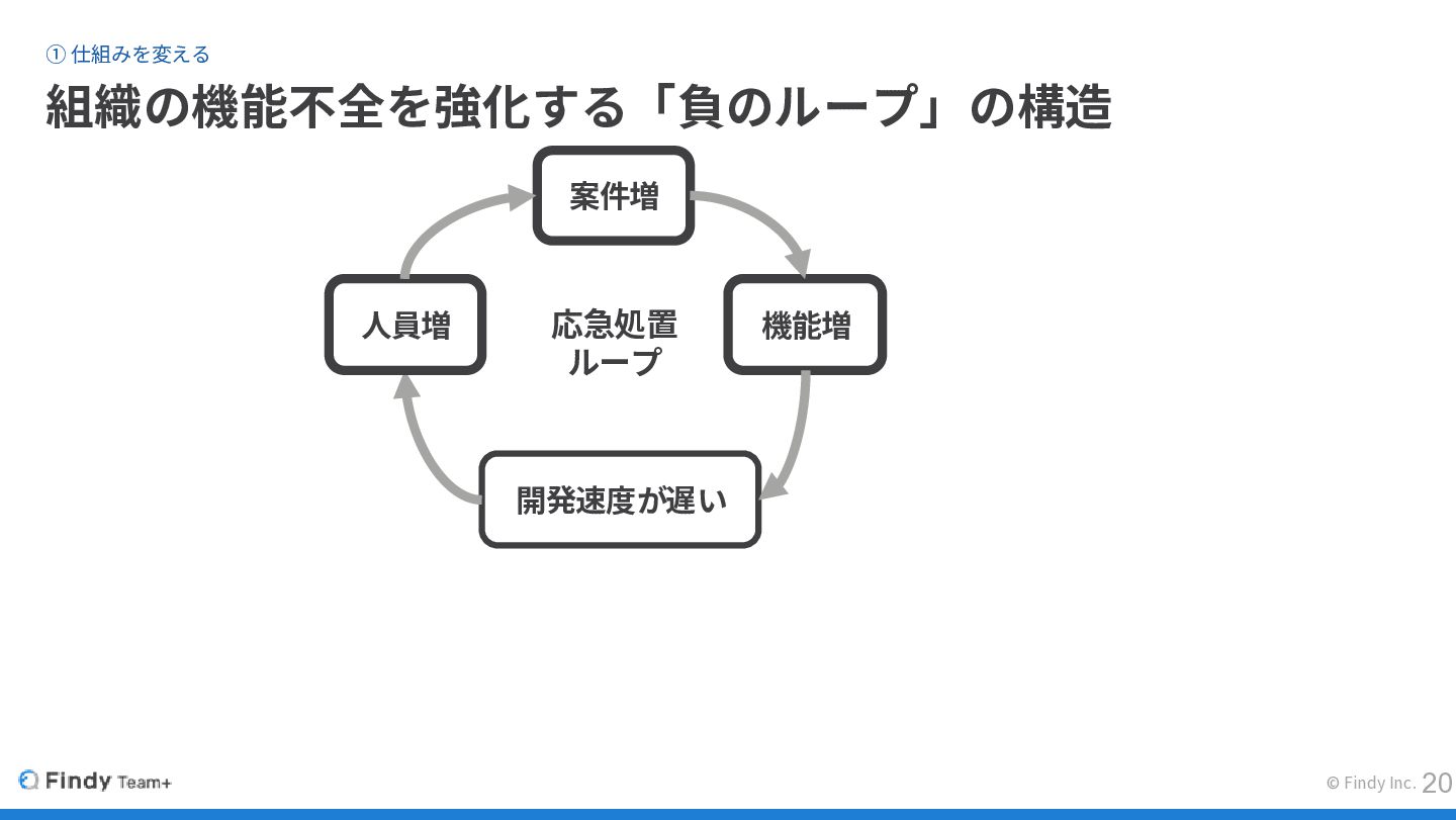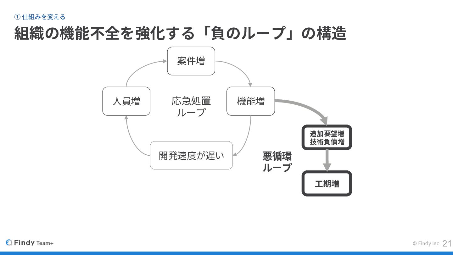 ① 仕組みを変える 組織の機能不全を強化する「負のループ」の構造 © Findy Inc. 開発速度が遅い 機能増 案件増 人員増