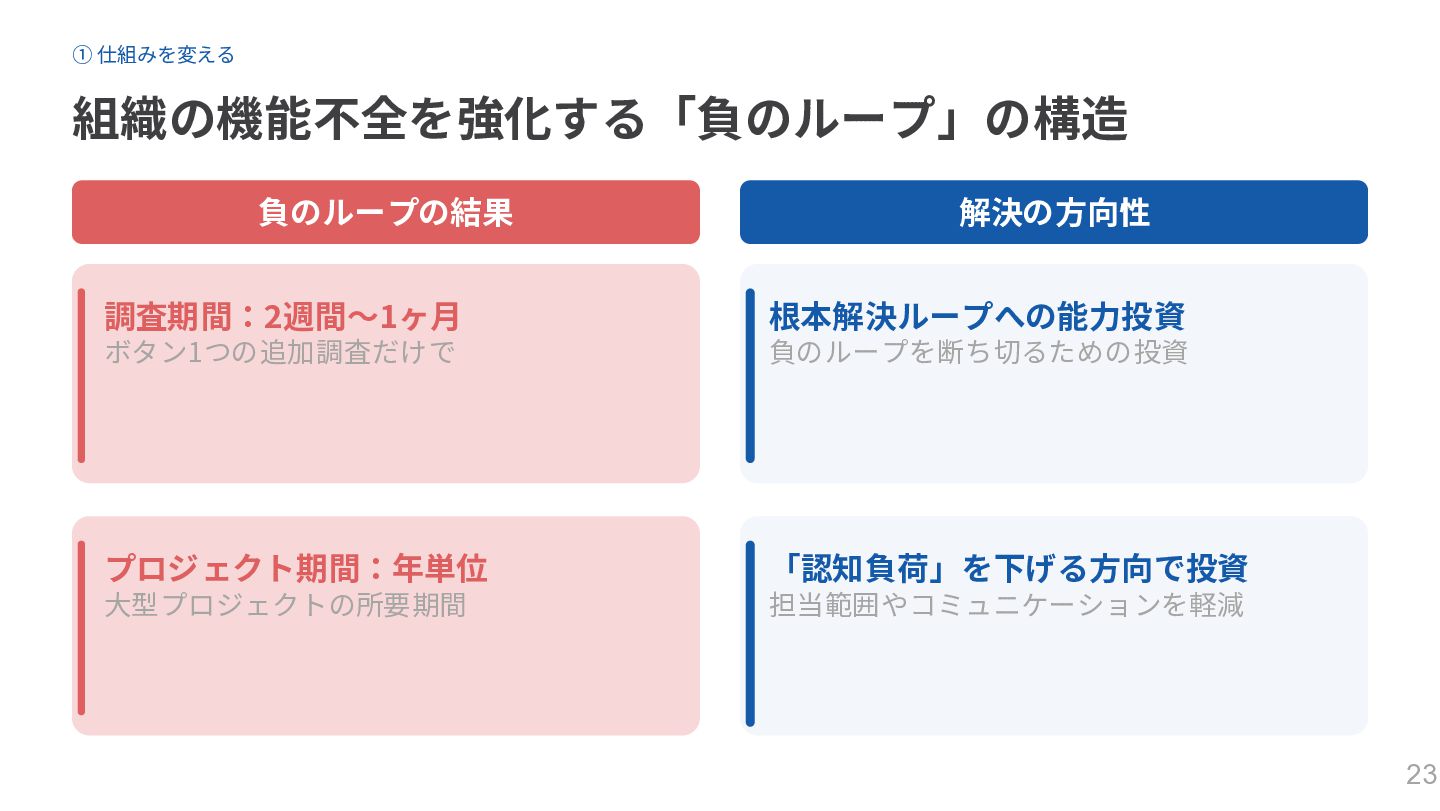 ① 仕組みを変える 組織の機能不全を強化する「負のループ」の構造 負のループの結果 調査期間:2週間〜1ヶ月 ボタン1つの追加調査だけで プロジェクト期間:年単位 大型プロジェクトの所要期間 解決の方向性 根本解決ループへの能力投資