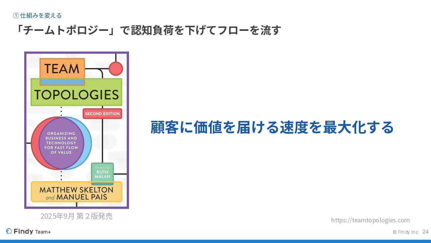 © Findy Inc. 「チームトポロジー」で認知負荷を下げてフローを流す ① 仕組みを変える 24 顧客に価値を届ける速度を最大化する 2025年9月 第2版発売