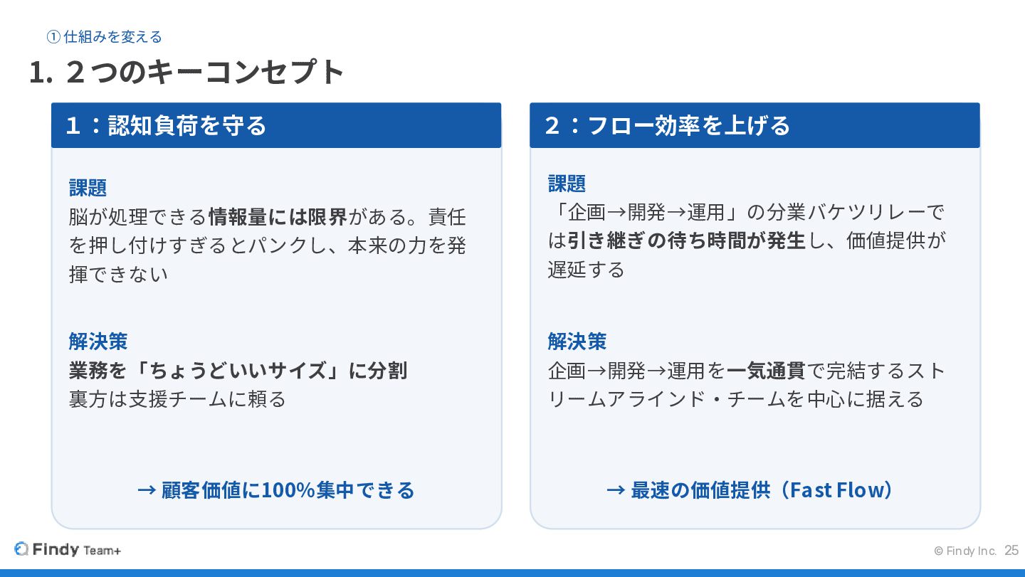 脳が処理できる情報量には限界がある。責任 を押し付けすぎるとパンクし、本来の力を発 揮できない 解決策 業務を「ちょうどいいサイズ」に分割 裏方は支援チームに頼る → 顧客価値に100%集中できる 課題 「企画→開発→運用」の分業バケツリレーで は引き継ぎの待ち時間が発生し、価値提供が 遅延する 解決策 企画→開発→運用を一気通貫で完結するスト リームアラインド・チームを中心に据える → 最速の価値提供(Fast Flow) 2:フロー効率を上げる