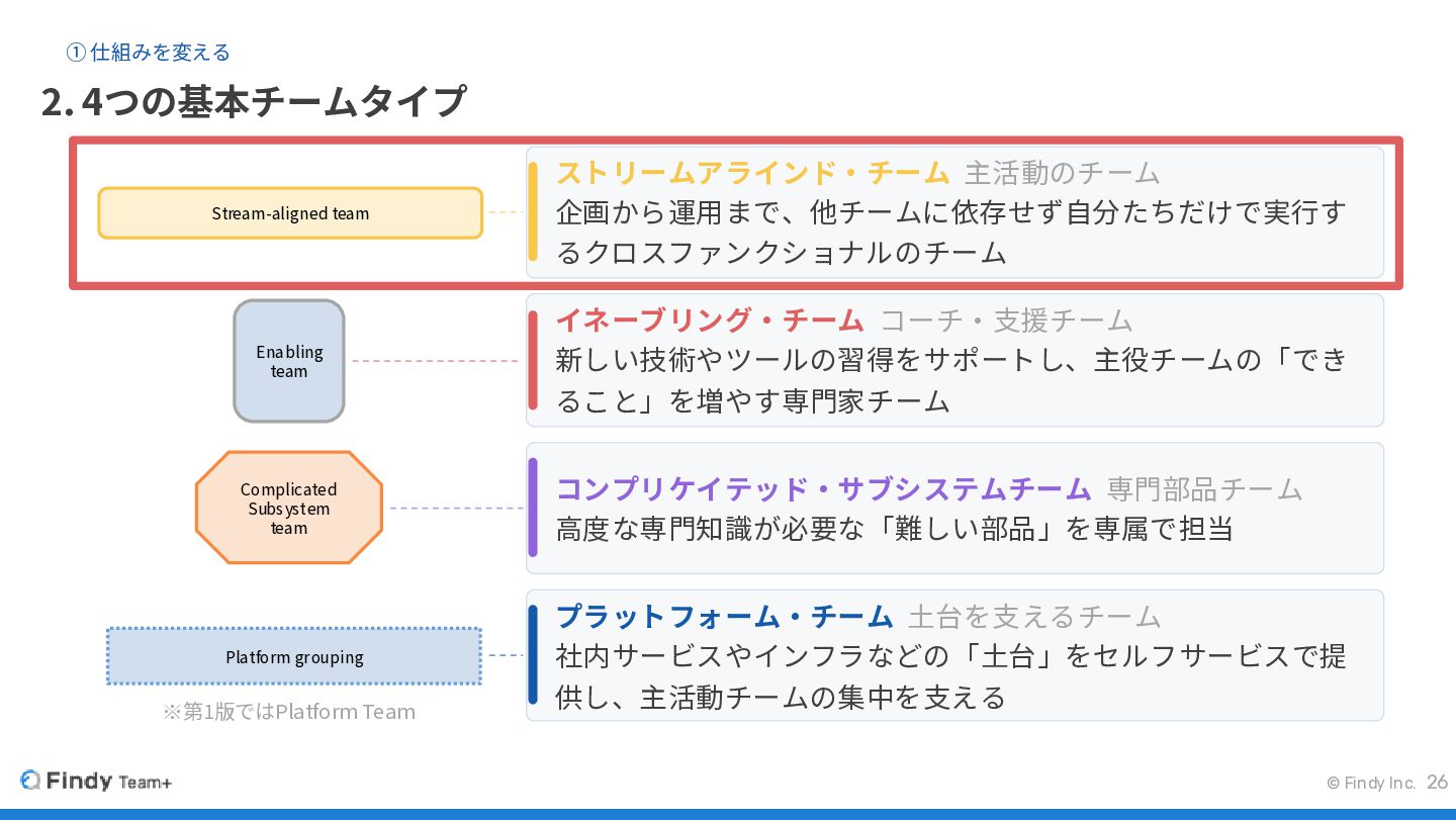© Findy Inc. 2. 4つの基本チームタイプ ① 仕組みを変える 26 Stream-aligned team