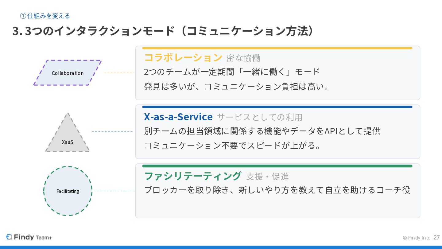 Facilitating コラボレーション 密な協働 2つのチームが一定期間「一緒に働く」モード 発見は多いが、コミュニケーション負担は高い。 X-as-a-Service サービスとしての利用 別チームの担当領域に関係する機能やデータをAPIとして提供 コミュニケーション不要でスピードが上がる。 ファシリテーティング 支援・促進 ブロッカーを取り除き、新しいやり方を教えて自立を助けるコーチ役