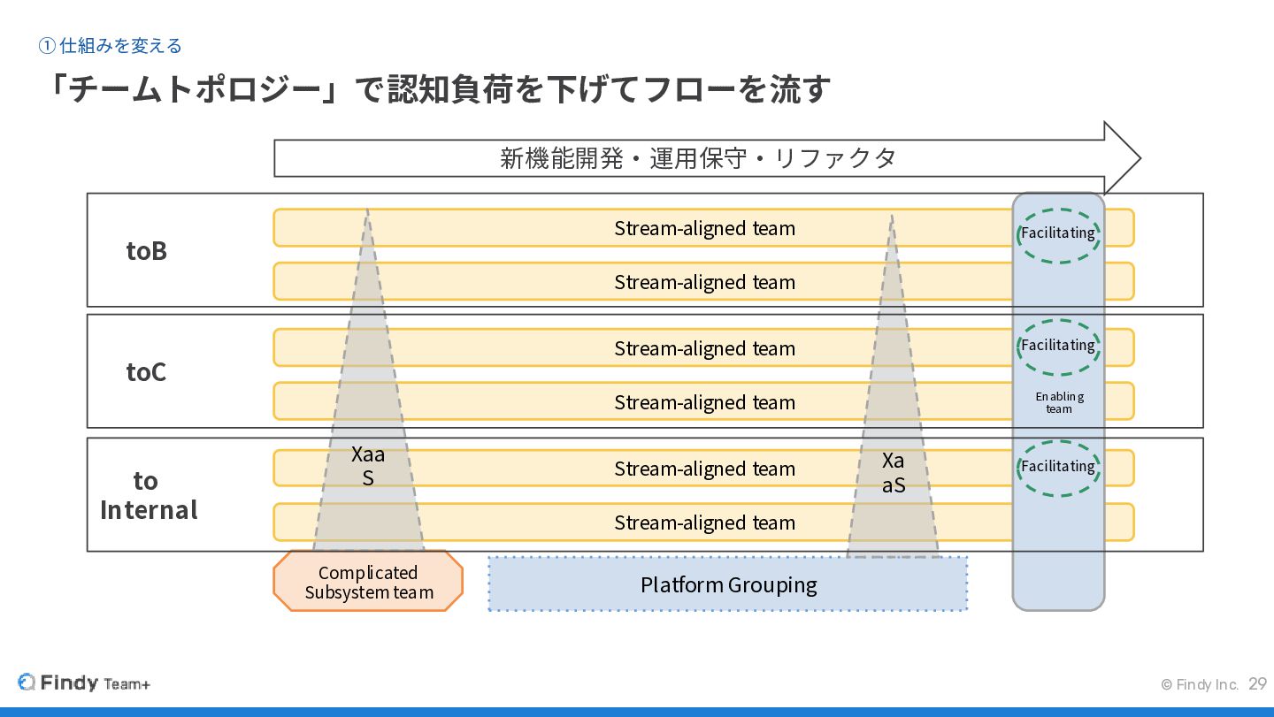 © Findy Inc. 「チームトポロジー」で認知負荷を下げてフローを流す ① 仕組みを変える 29 Stream-aligned team Stream-aligned