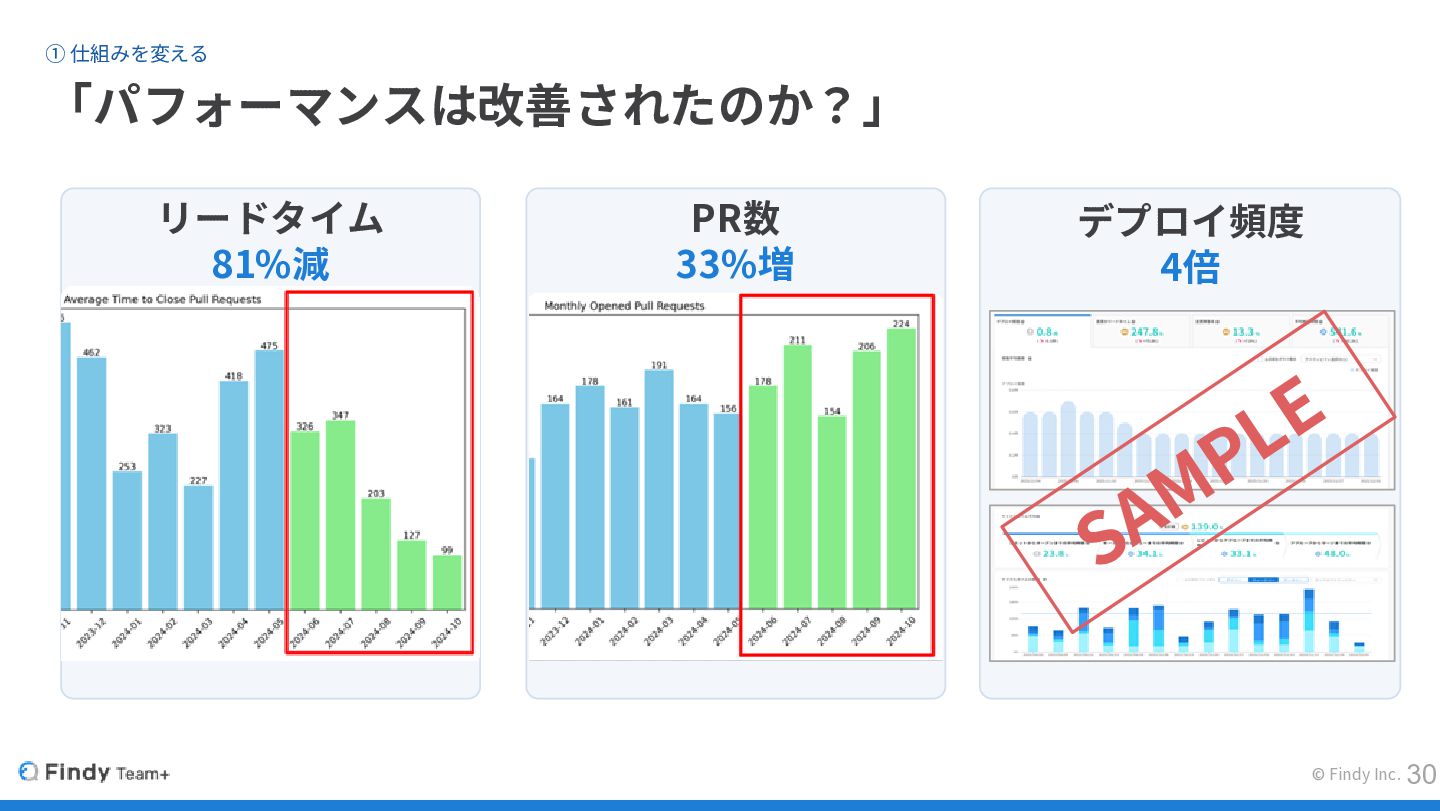 デプロイ頻度 4倍 © Findy Inc. ① 仕組みを変える 「パフォーマンスは改善されたのか?」 リードタイム 81%減