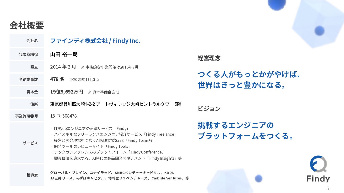 経営理念 会社名 ファインディ株式会社 / Findy Inc. 代表取締役 山田 裕一朗 設立 2014 年 2 月 ※ 本格的な事業開始は2016年7月 全従業員数 478 名 ※2026年1月時点 資本金 19億9,692万円 ※ 資本準備金含む 住所 東京都品川区大崎1-2-2 アートヴィレッジ大崎セントラルタワー 5階 事業許可番号 13-ユ-308478 サービス ・IT/Webエンジニアの転職サービス「Findy」 ・ハイスキルなフリーランスエンジニア紹介サービス「Findy Freelance」 ・経営と開発現場をつなぐAI戦略支援SaaS「Findy Team+」 ・開発ツールのレビューサイト「Findy Tools」 ・テックカンファレンスのプラットフォーム「Findy Conference」 ・顧客価値を追求する、AI時代の製品開発マネジメント「Findy Insights」等 投資家 グローバル・ブレイン、ユナイテッド、SMBCベンチャーキャピタル、KDDI、 JA三井リース、みずほキャピタル、博報堂DYベンチャーズ、Carbide Ventures、等 5