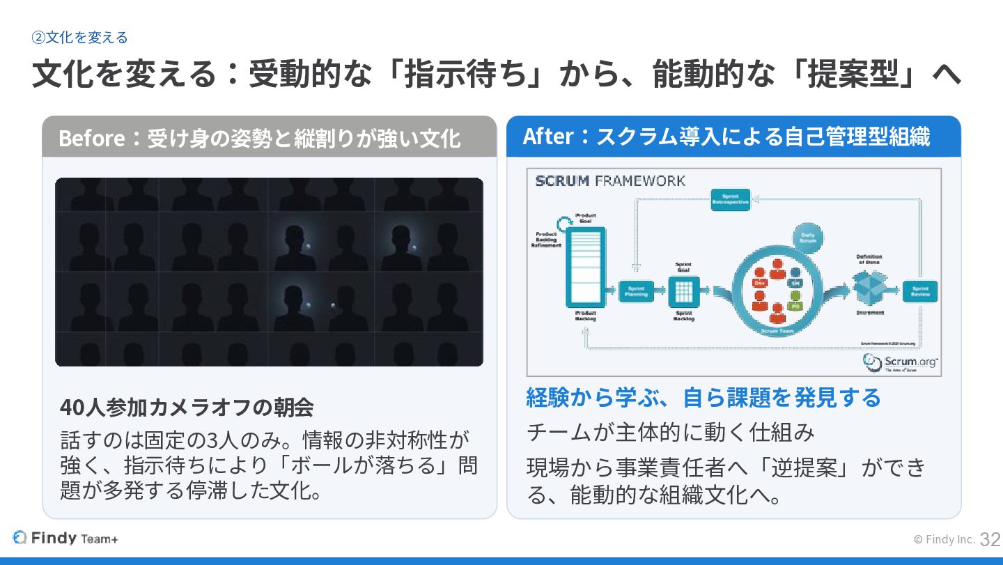 © Findy Inc. ②文化を変える 文化を変える:受動的な「指示待ち」から、能動的な「提案型」へ Before:受け身の姿勢と縦割りが強い文化 40人参加カメラオフの朝会 話すのは固定の3人のみ。情報の非対称性が 強く、指示待ちにより「ボールが落ちる」問 題が多発する停滞した文化。