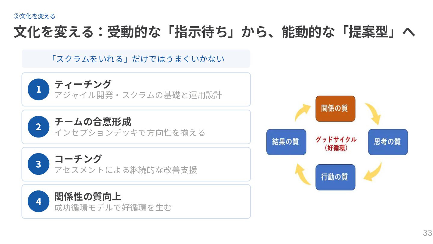 ②文化を変える 文化を変える:受動的な「指示待ち」から、能動的な「提案型」へ 「スクラムをいれる」だけではうまくいかない 1 ティーチング アジャイル開発・スクラムの基礎と運用設計 2 チームの合意形成 インセプションデッキで方向性を揃える 3