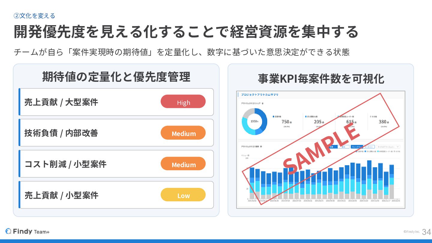 © Findy Inc. ②文化を変える 開発優先度を見える化することで経営資源を集中する チームが自ら「案件実現時の期待値」を定量化し、数字に基づいた意思決定ができる状態 期待値の定量化と優先度管理 アウトカム分析(参考) 売上貢献 /