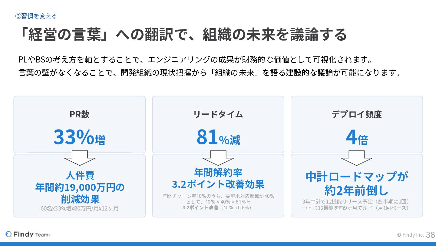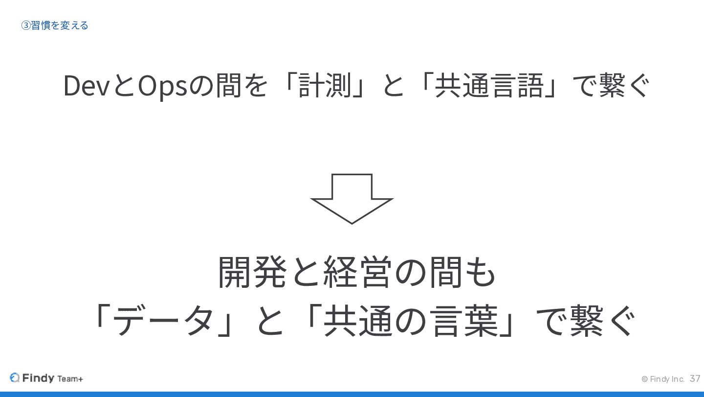 © Findy Inc. ③習慣を変える 37 DevとOpsの間を「計測」と「共通言語」で繋ぐ 開発と経営の間も 「データ」と「共通の言葉」で繋ぐ
