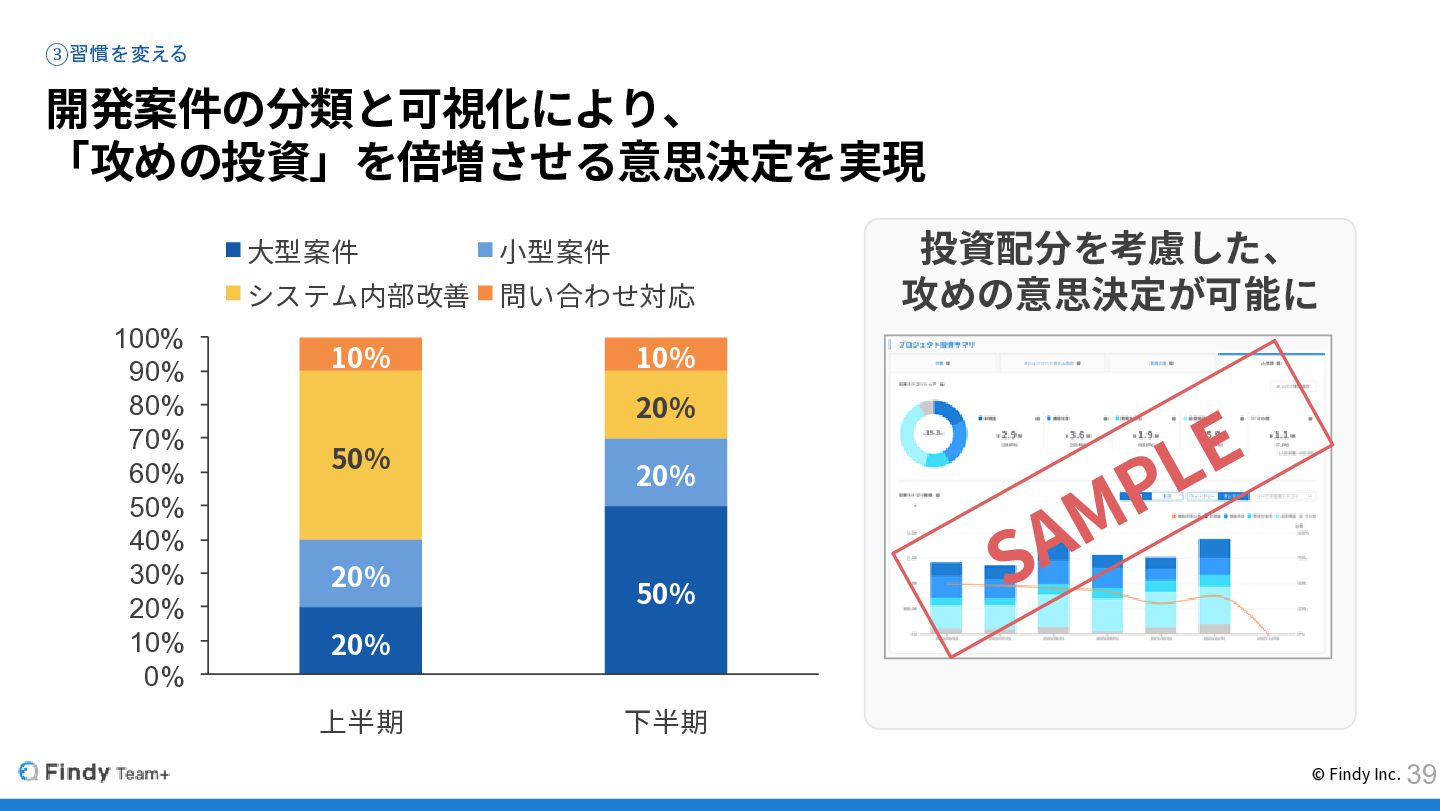 ③習慣を変える 開発案件の分類と可視化により、 「攻めの投資」を倍増させる意思決定を実現 © Findy Inc. 20% 50% 20% 20%
