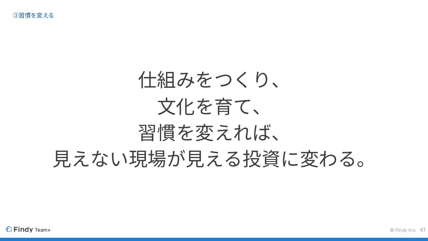 © Findy Inc. ③習慣を変える 41 仕組みをつくり、 文化を育て、 習慣を変えれば、 見えない現場が見える投資に変わる。