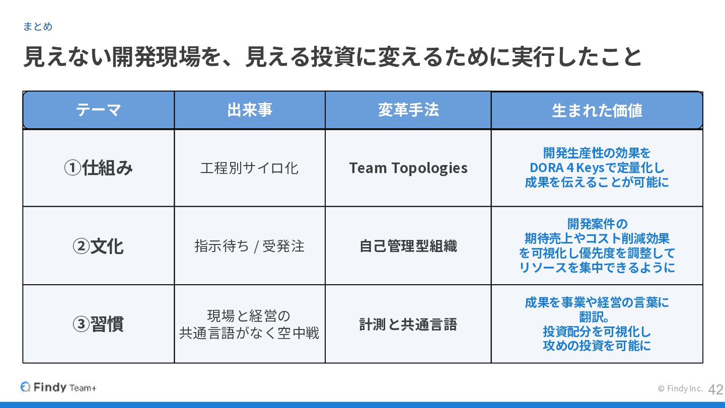 まとめ 見えない開発現場を、見える投資に変えるために実行したこと © Findy Inc. ②文化 指示待ち / 受発注 自己管理型組織