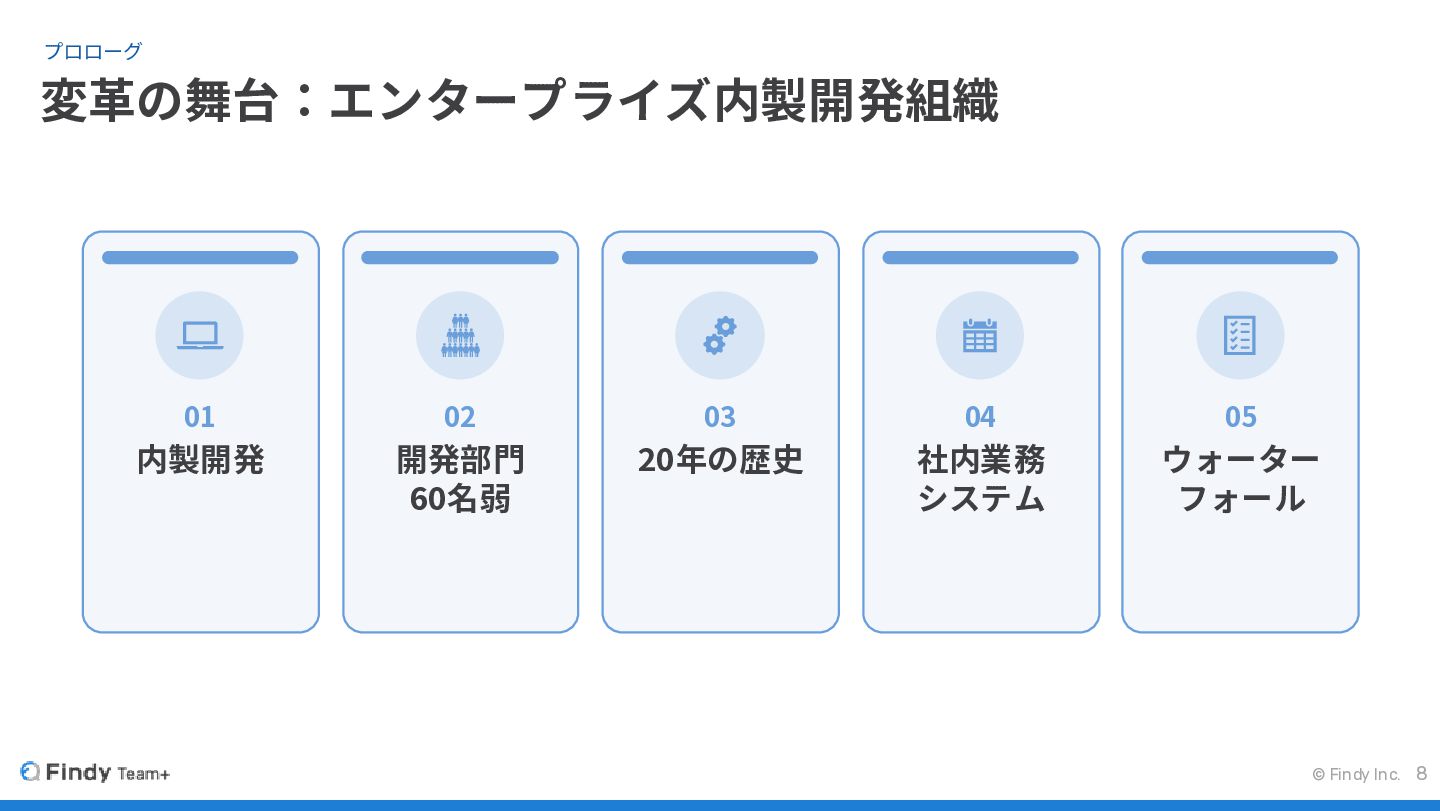 © Findy Inc. 変革の舞台:エンタープライズ内製開発組織 プロローグ 8 01 内製開発 02 開発部門
