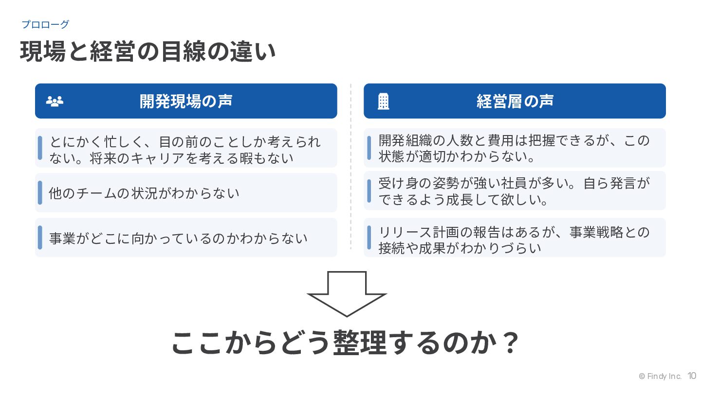経営層の声 開発組織の人数と費用は把握できるが、この 状態が適切かわからない。 リリース計画の報告はあるが、事業戦略との 接続や成果がわかりづらい 受け身の姿勢が強い社員が多い。自ら発言が できるよう成長して欲しい。 ここからどう整理するのか? プロローグ