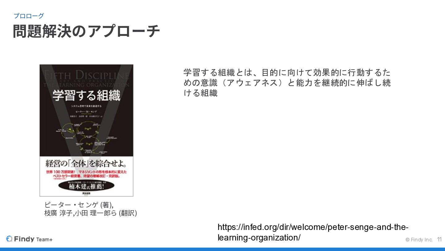 © Findy Inc. 問題解決のアプローチ プロローグ 11 学習する組織とは、目的に向けて効果的に行動するた めの意識(アウェアネス)と能力を継続的に伸ばし続 ける組織 ピーター・センゲ