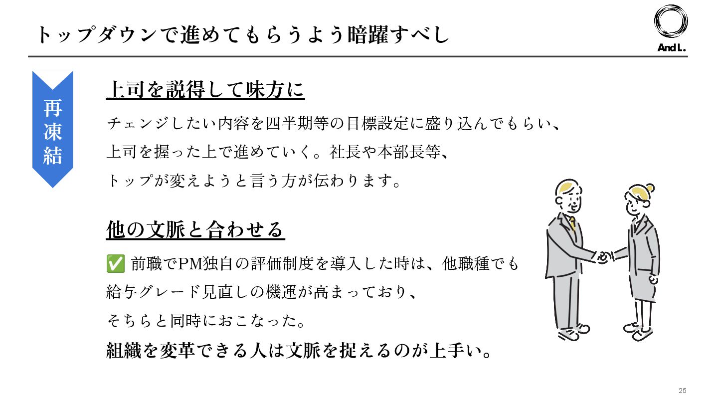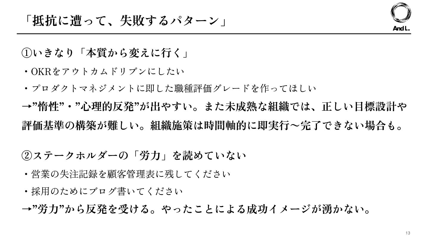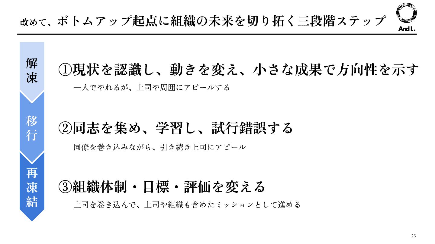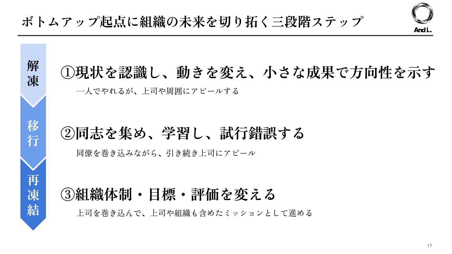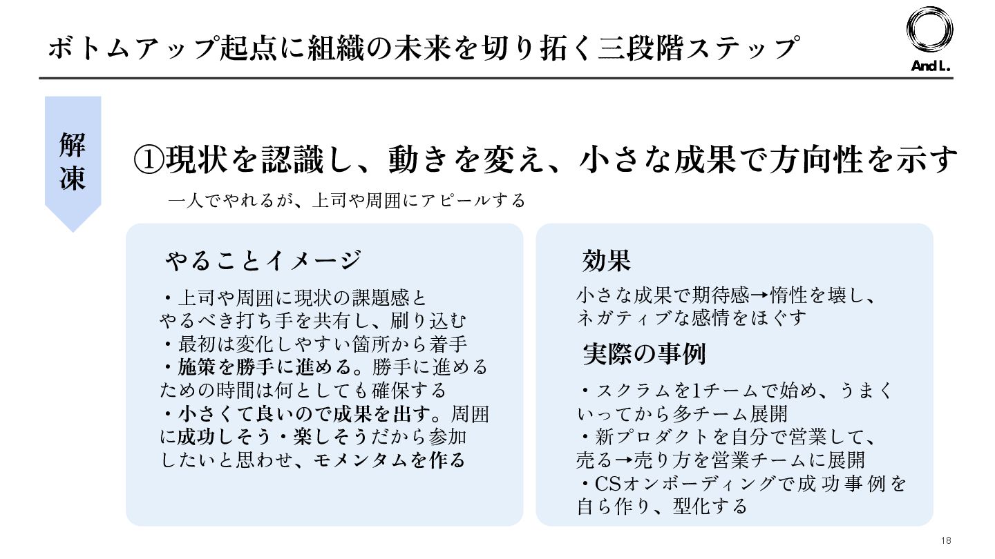 変える ・プロダクトマネジメントの成功指標 を評価や給与グレード等に盛り込む ・ちゃんと上司と合意した上で、 組織の目標・方針として進めて もらう 効果 成果を連続して出せるようになって きたため、大上段を固めても大外しが ない。固めることで習慣化し、文化と して定着を狙う。 実際の事例 ・プロダクトゴールをアウトプット→ アウトカムドリブンに ・誰にどんな価値を提供するか明確に なったので、ミッションをリニューアル 上司を巻き込んで、上司や組織も含めたミッションとして進める ボトムアップ起点に組織の未来を切り拓く三段階ステップ