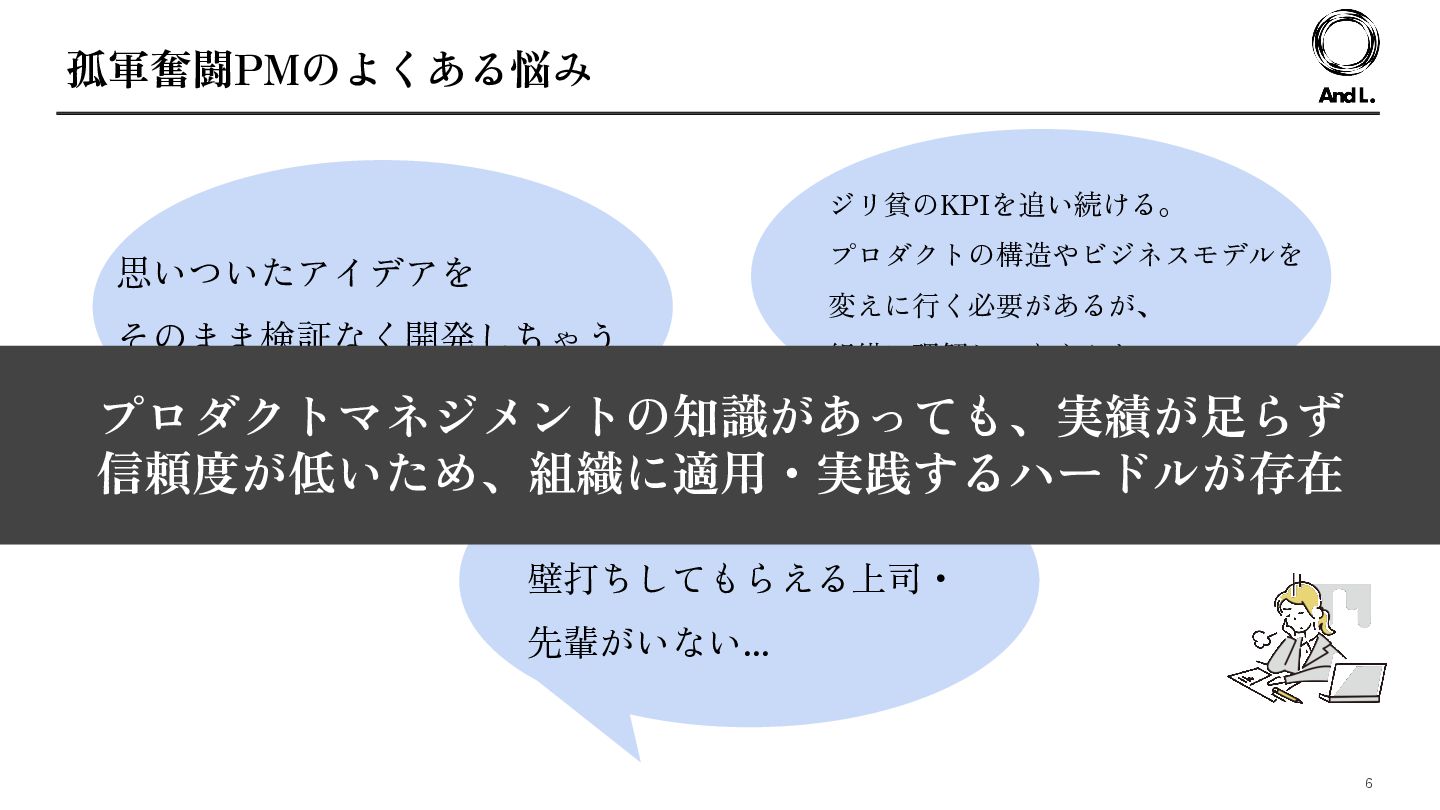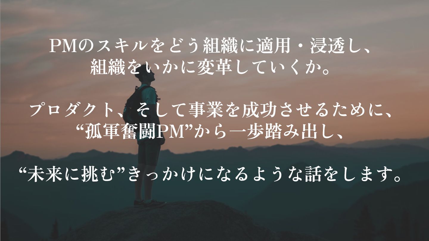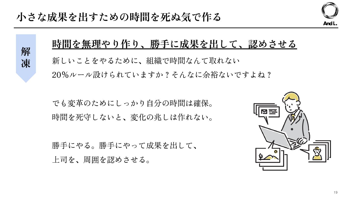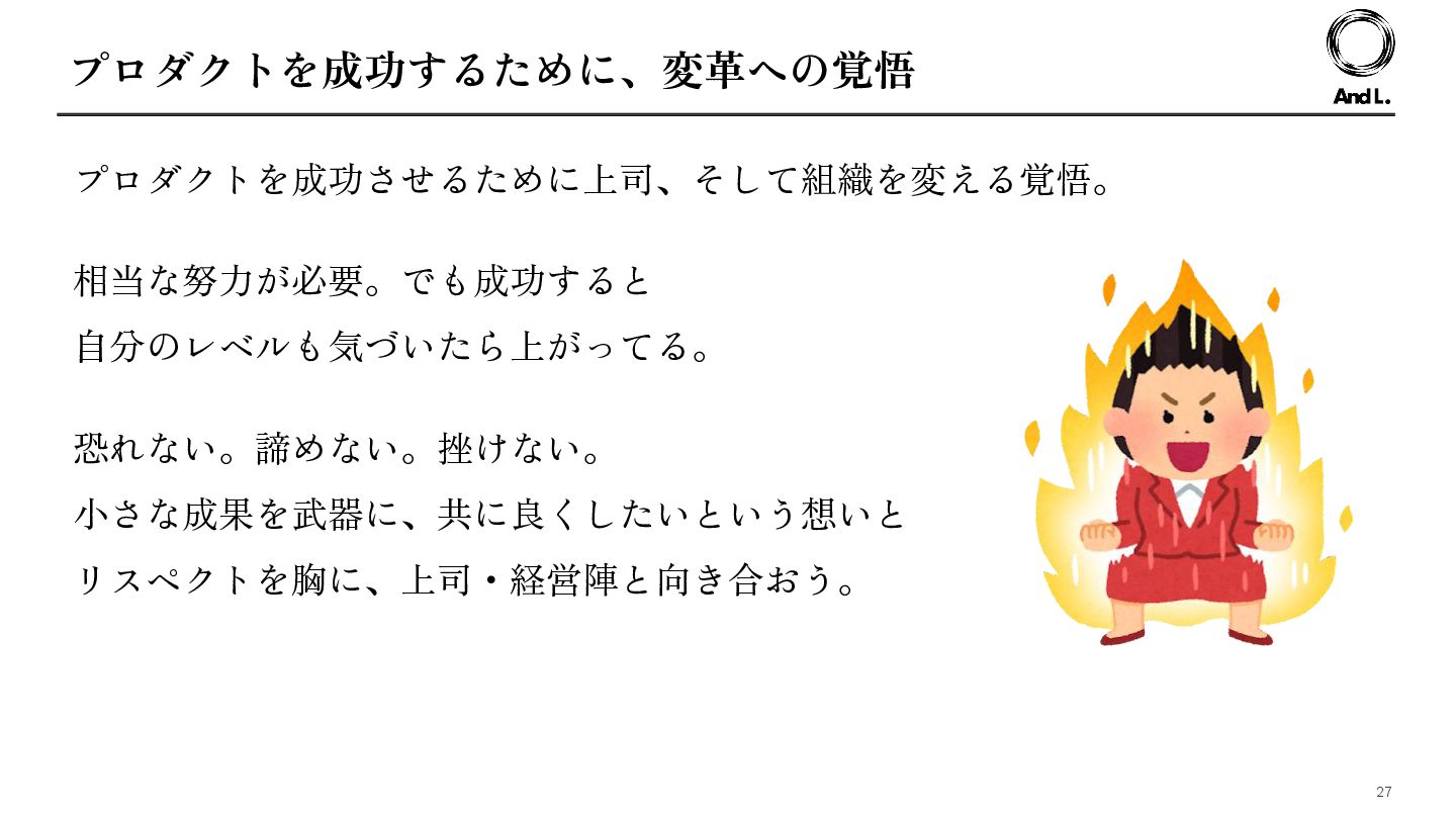 変える ・プロダクトマネジメントの成功指標 を評価や給与グレード等に盛り込む ・ちゃんと上司と合意した上で、 組織の目標・方針として進めて もらう 効果 成果を連続して出せるようになって きたため、大上段を固めても大外しが ない。固めることで習慣化し、文化と して定着を狙う。 実際の事例 ・プロダクトゴールをアウトプット→ アウトカムドリブンに ・誰にどんな価値を提供するか明確に なったので、ミッションをリニューアル 上司を巻き込んで、上司や組織も含めたミッションとして進める ボトムアップ起点に組織の未来を切り拓く三段階ステップ