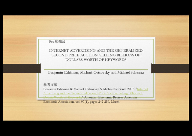 OF DOLLARS WORTH OF KEYWORDS Benjamin Edelman, Michael Ostrovsky and Michael Schwarz 参考文献 Benjamin Edelman & Michael Ostrovsky & Michael Schwarz, 2007. "Internet Advertising and the Generalized Second-Price Auction: Selling Billions of Dollars Worth of Keywords," American Economic Review, American Economic Association, vol. 97(1), pages 242-259, March. For 勉強会