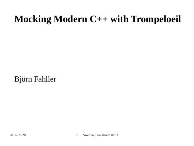 #include <trompeloeil.hpp> struct mock_store : public store { MAKE_CONST_MOCK1(inventory, size_t(const std::string&), override); MAKE_MOCK2(remove, void(const std::string&, size_t), override); }; TEST_CASE(“filling removes inventory when in stock”) { mock_store whisky_store; order o{“Talisker”, 50}; { REQUIRE_CALL(whisky_store, inventory(“Talisker”)) .RETURN(51); REQUIRE_CALL(whisky_store, remove(“Talisker”, 50)); } } Place expectations on The mock, requiring what must happen, and how to act. Expectations must be fulfilled at end of scope, otherwise a violation is reported. Everything is forbidden until explicitly required.