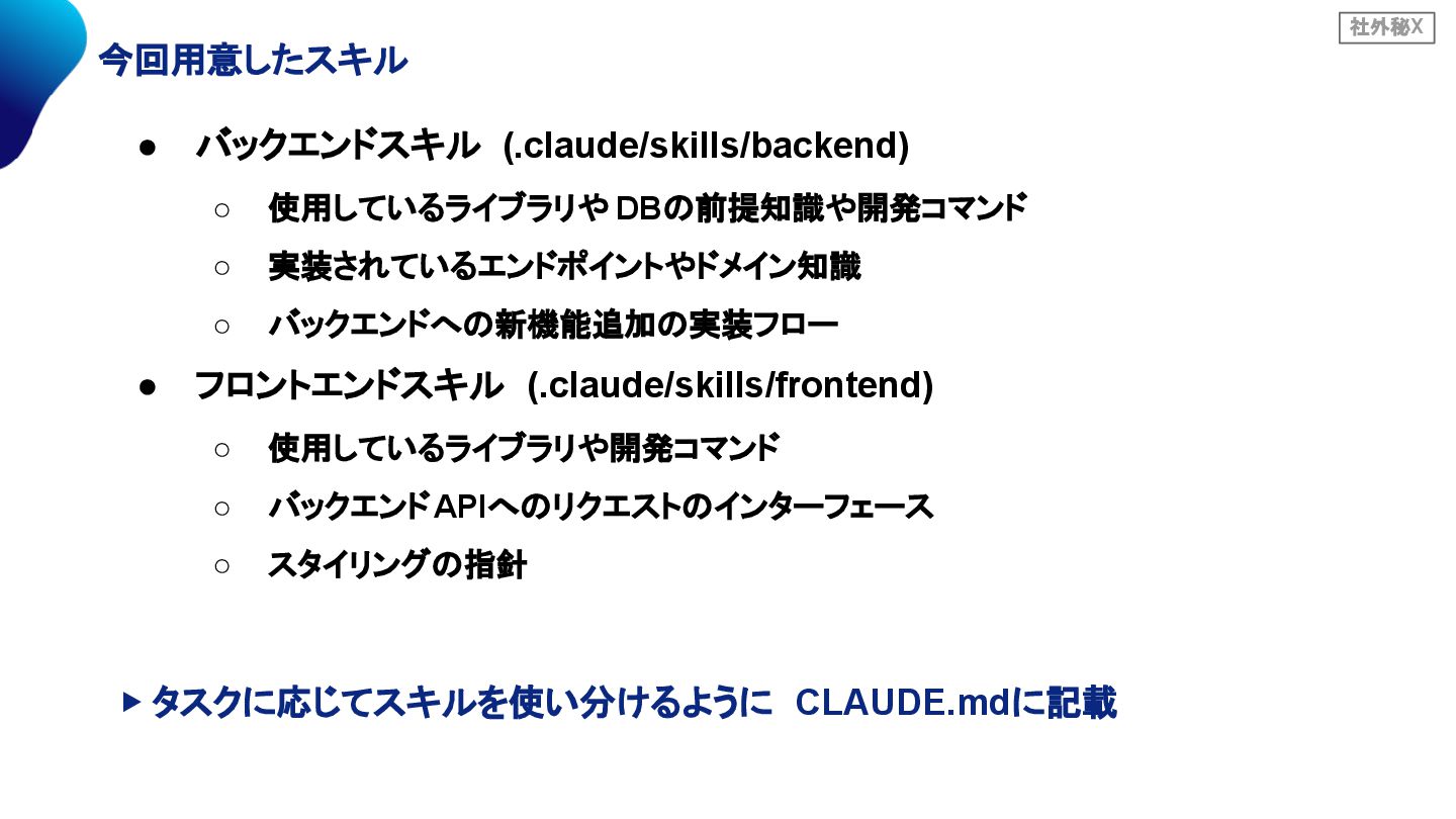 社外秘X 今回用意したスキル • バックエンドスキル (.claude/skills/backend) ◦ 使用しているライブラリや DBの前提知識や開発コマンド ◦ 実装されているエンドポイントやドメイン知識