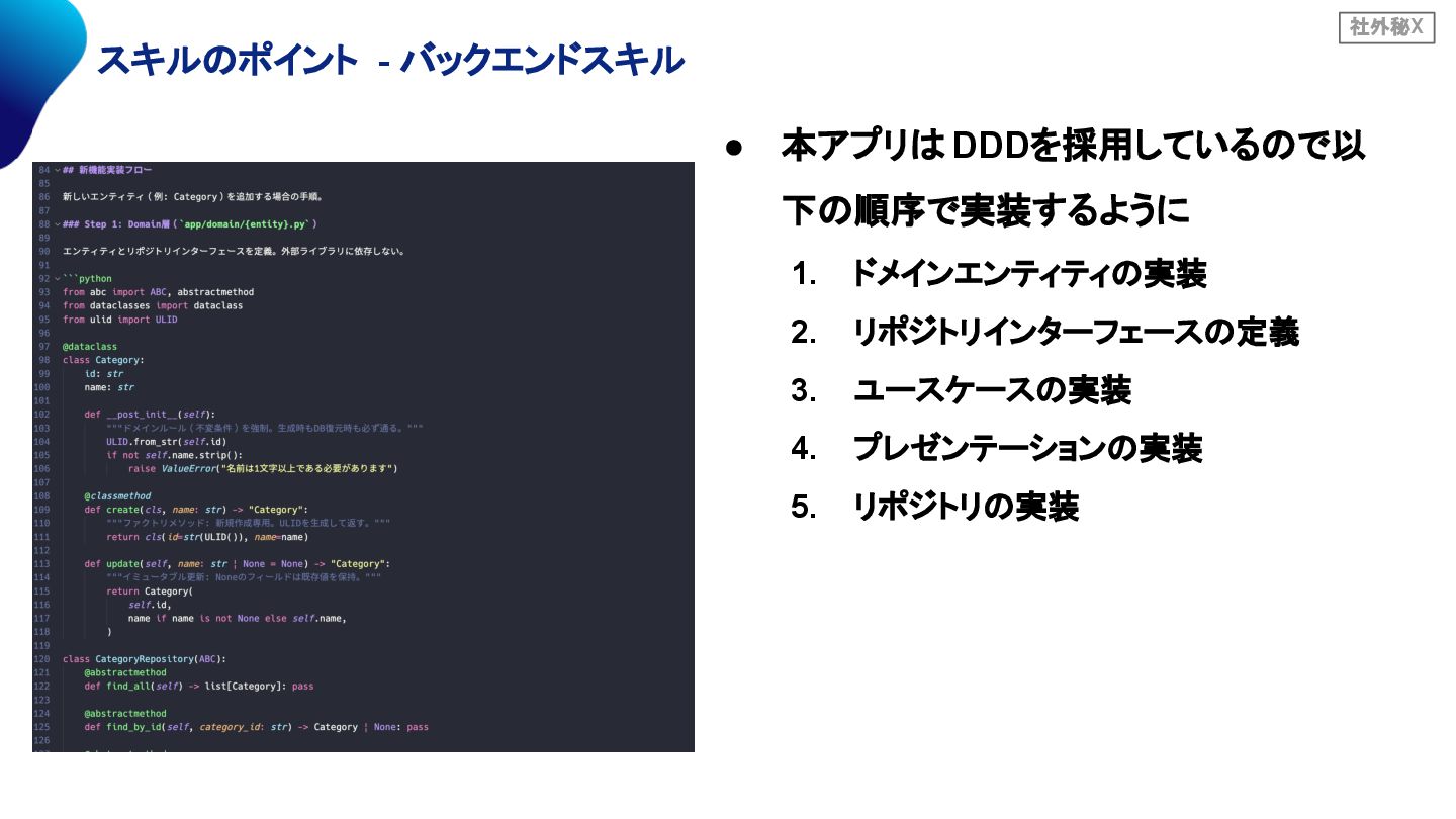 社外秘X スキルのポイント - バックエンドスキル • 本アプリは DDDを採用しているので以 下の順序で実装するように 1. ドメインエンティティの実装