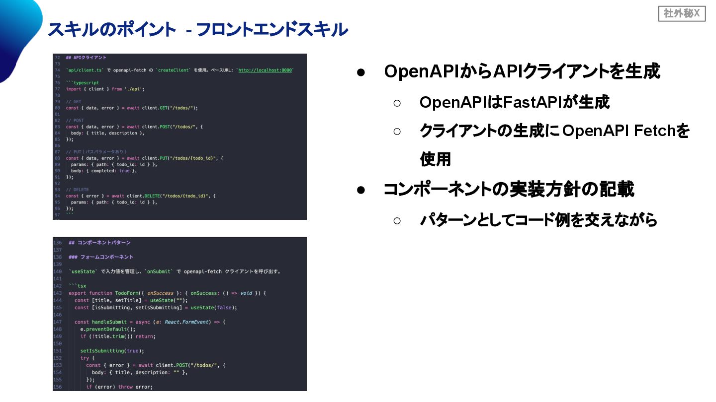 社外秘X スキルのポイント - フロントエンドスキル • OpenAPIからAPIクライアントを生成 ◦ OpenAPIはFastAPIが生成 ◦ クライアントの生成に