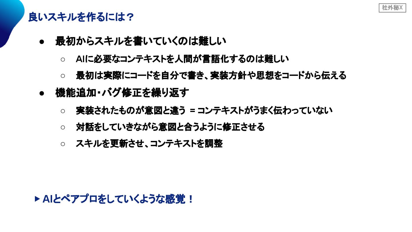 社外秘X 良いスキルを作るには? • 最初からスキルを書いていくのは難しい ◦ AIに必要なコンテキストを人間が言語化するのは難しい ◦ 最初は実際にコードを自分で書き、実装方針や思想をコードから伝える • 機能追加・バグ修正を繰り返す
