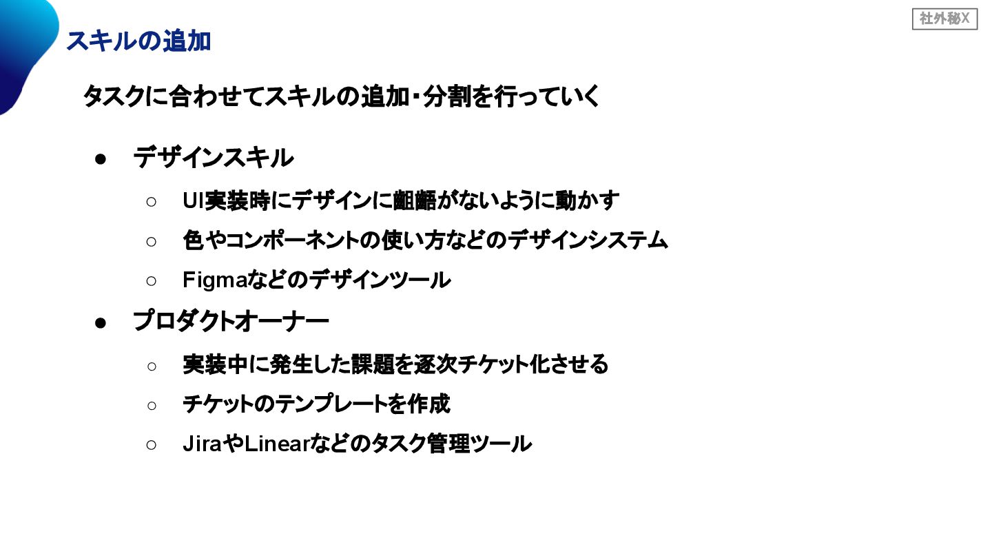 社外秘X スキルの追加 タスクに合わせてスキルの追加・分割を行っていく • デザインスキル ◦ UI実装時にデザインに齟齬がないように動かす ◦ 色やコンポーネントの使い方などのデザインシステム ◦