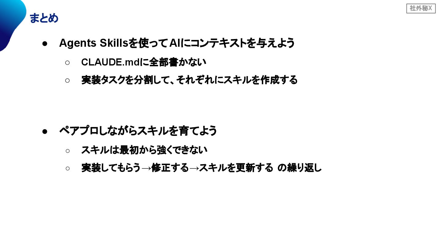 社外秘X まとめ • Agents Skillsを使ってAIにコンテキストを与えよう ◦ CLAUDE.mdに全部書かない ◦ 実装タスクを分割して、それぞれにスキルを作成する •